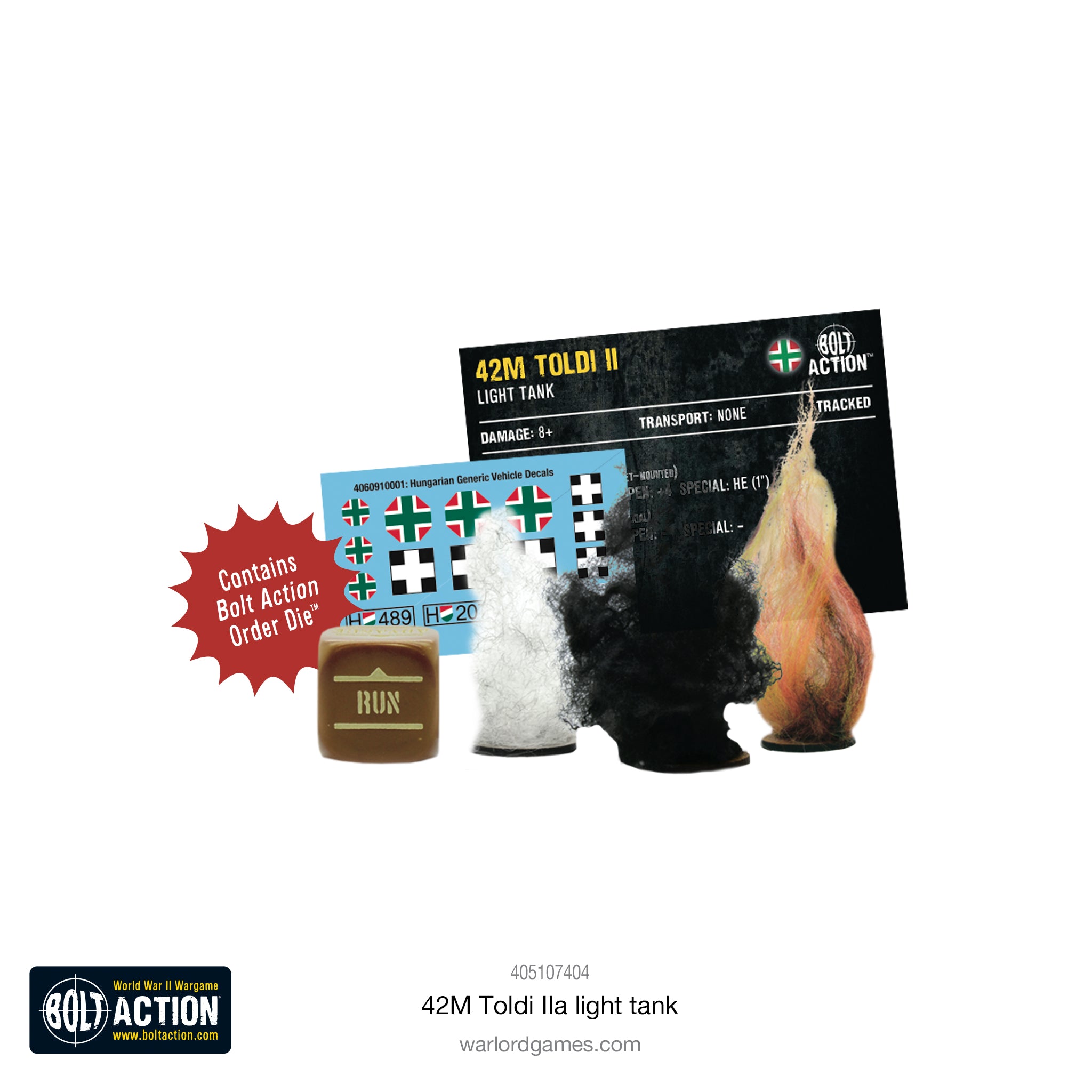 Box contains one 42M Toldi Iia Light tank, cast in resin & metal , with waterslide decal sheet, Bolt Action Order Die, Bolt Action: Third Edition vehicle stat card, and vehicle damage markers.