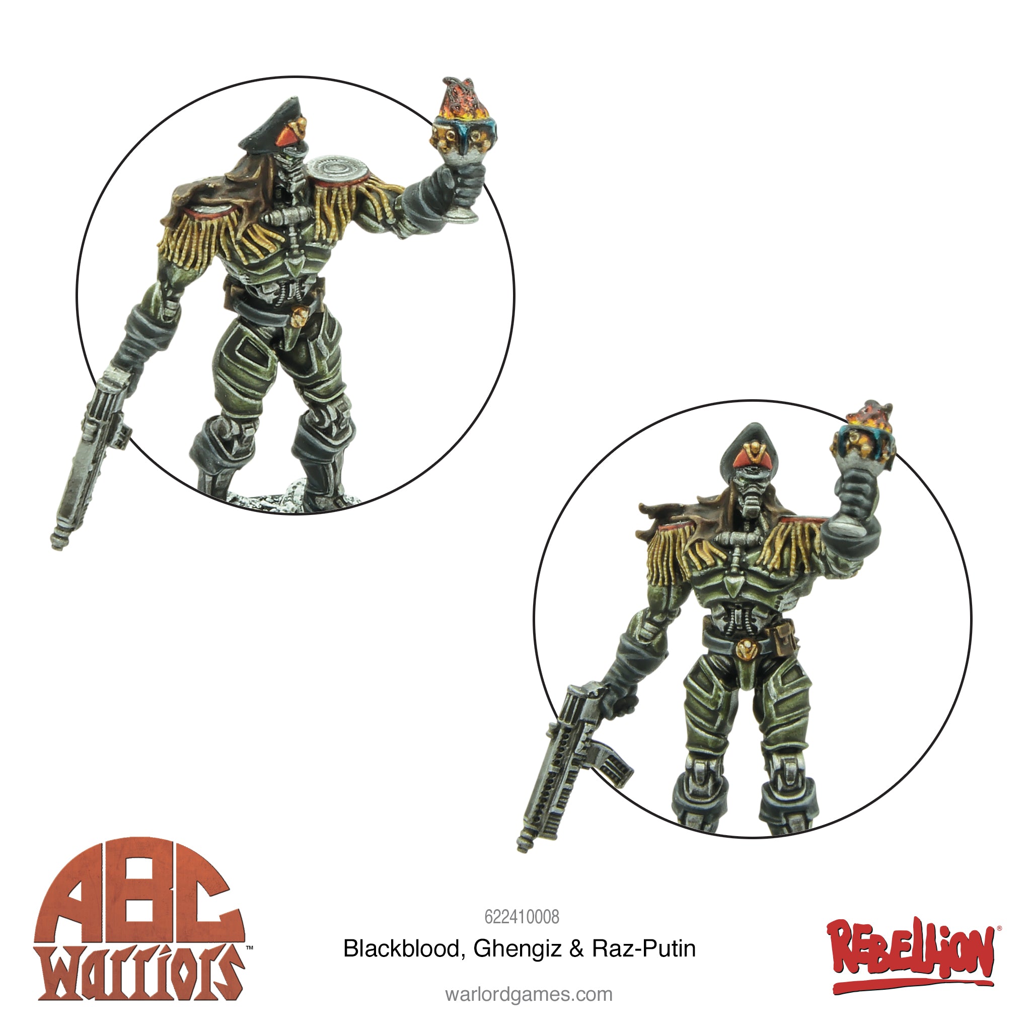 Contains three Warlord Resin Volgan miniatures: General Blackblood, Ghengiz & Raz-Putin, characters cards and plastic bases.