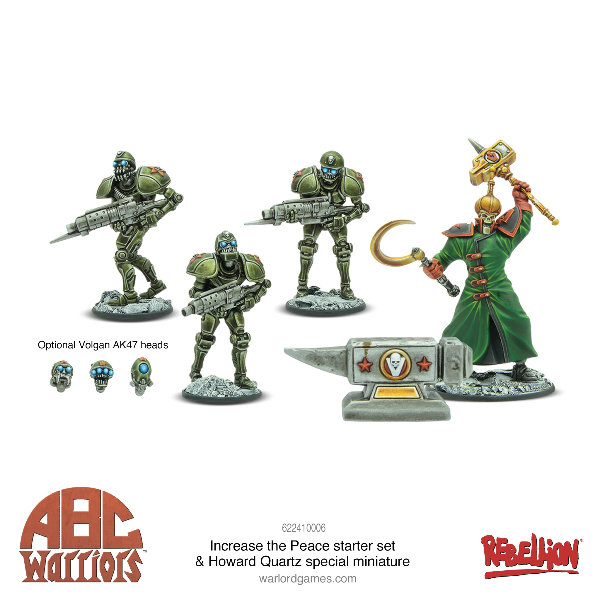 ABC Warriors: Increase the Peace is a skirmish tabletop miniatures game for two or more players based on the legendary 2000 AD comic series ABC Warriors: The Volgan War written by Pat Mills and lavishly illustrated by Clint Langley. Supreme military robots, created for a conflict that ended centuries ago, the ABC Warriors are built to endure warfare in all its deadly forms – atomic, bacterial and chemical.