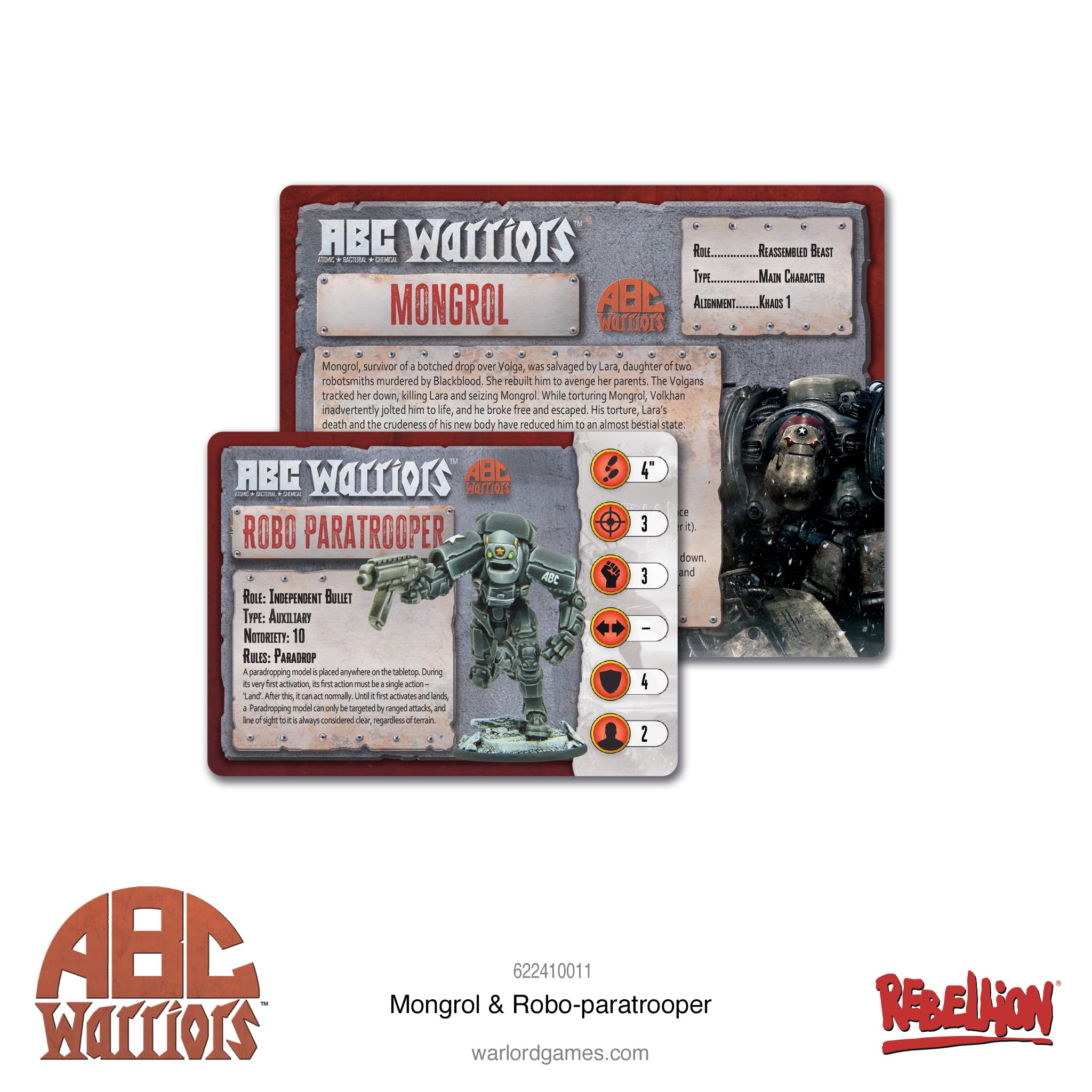 Contains two Warlord Resin ABC Warriors miniatures: Mongrol and a Robo-paratrooper, plastic bases, character card and auxiliary card.