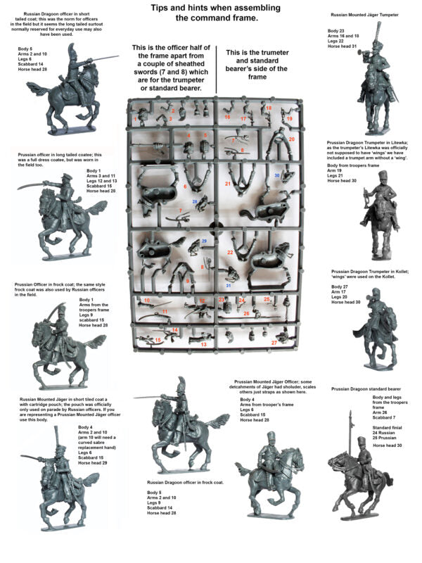 This set allows you to build not only Prussian and Russian Dragoon but also Russian Mounted Jäger regiments plus detachments of Prussian Mounted Volunteer Jäger. The Prussian regiments can be represented in either Kollet or in the campaign Litewka. There are a large variety of options for poses; charging/ attacking as well as shouldered swords for all.