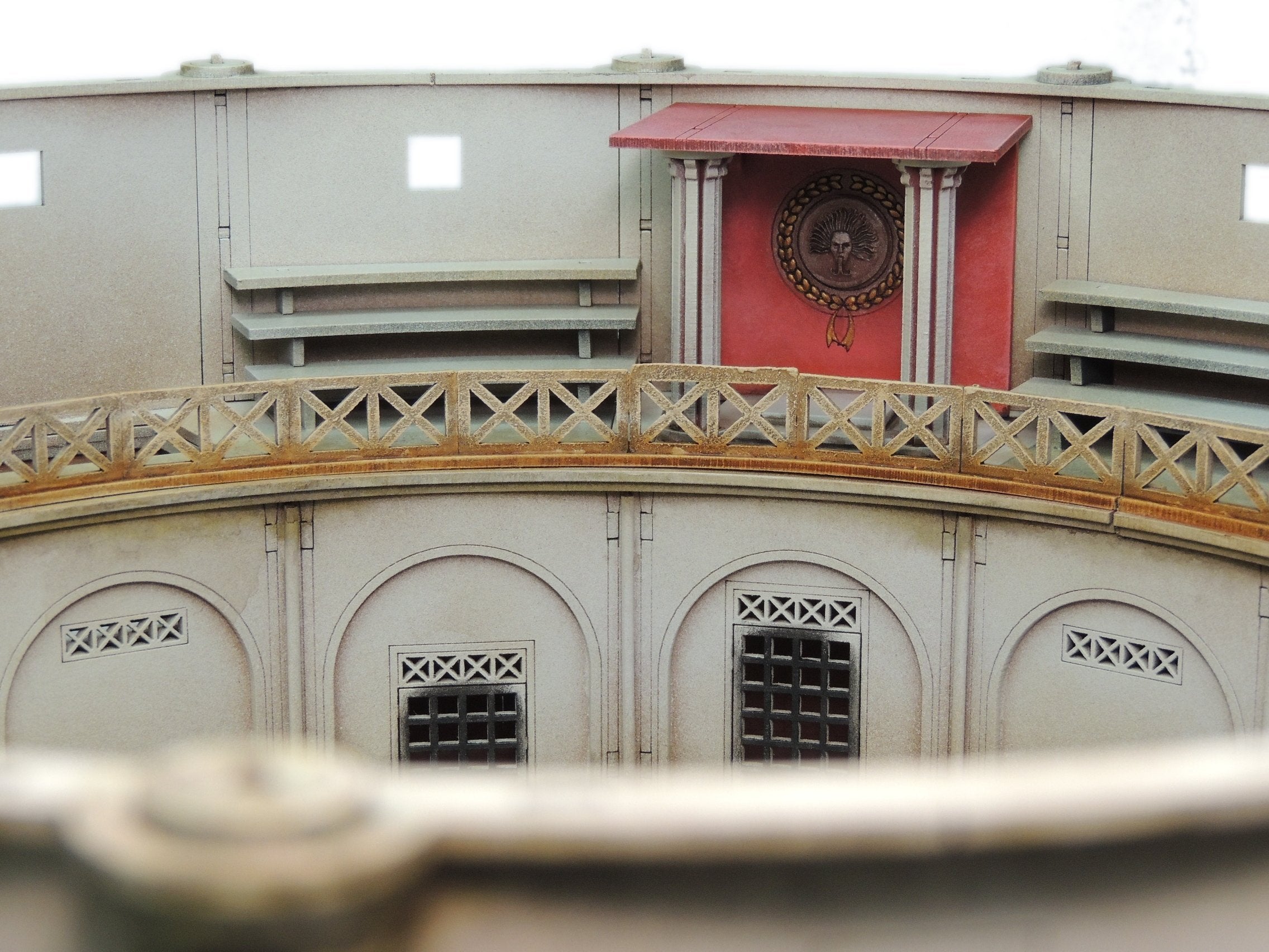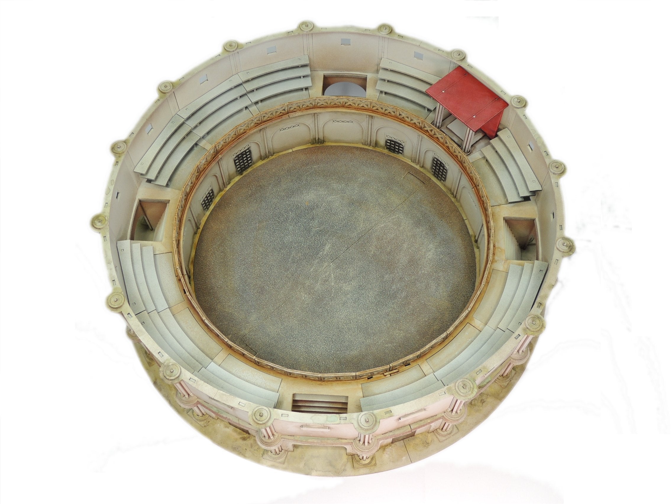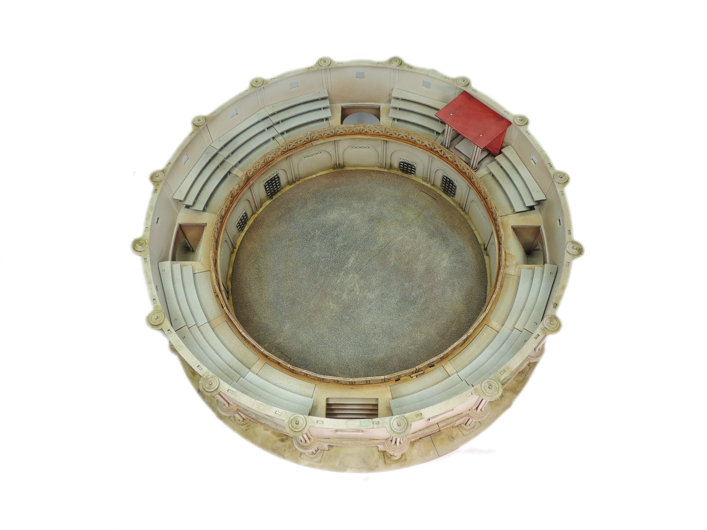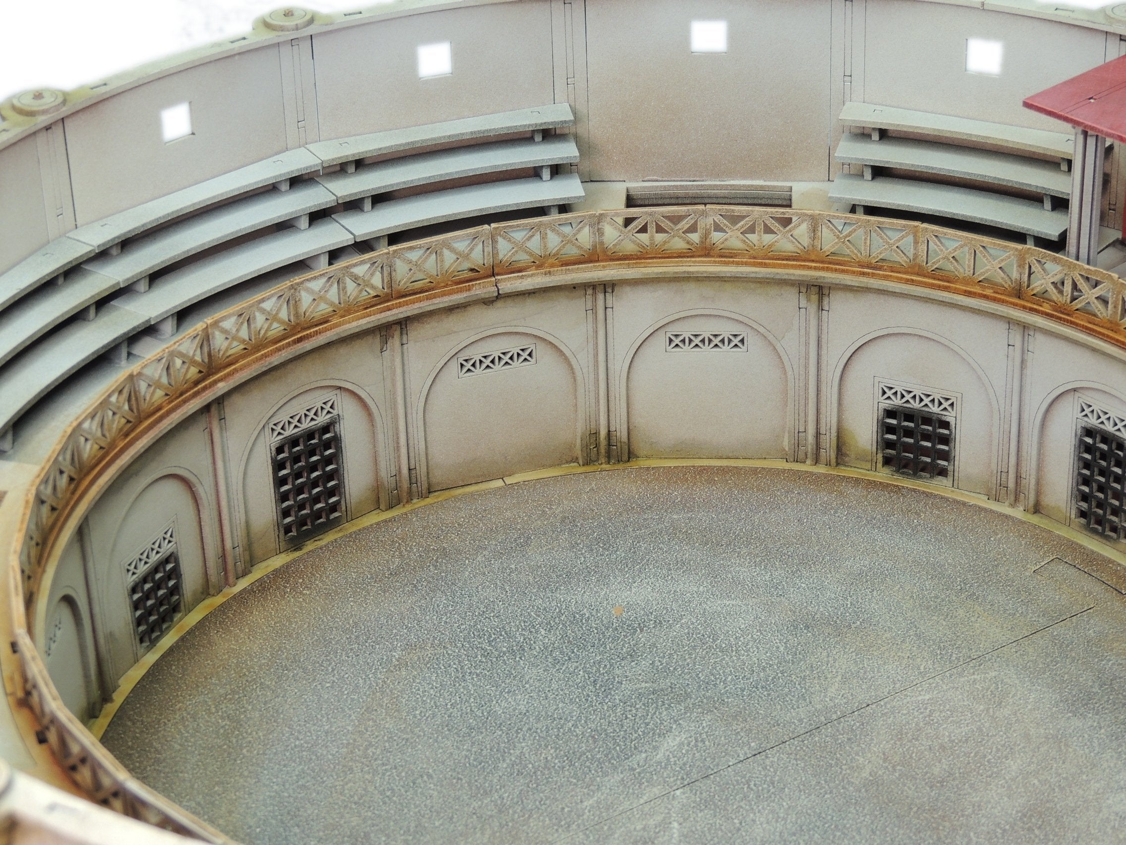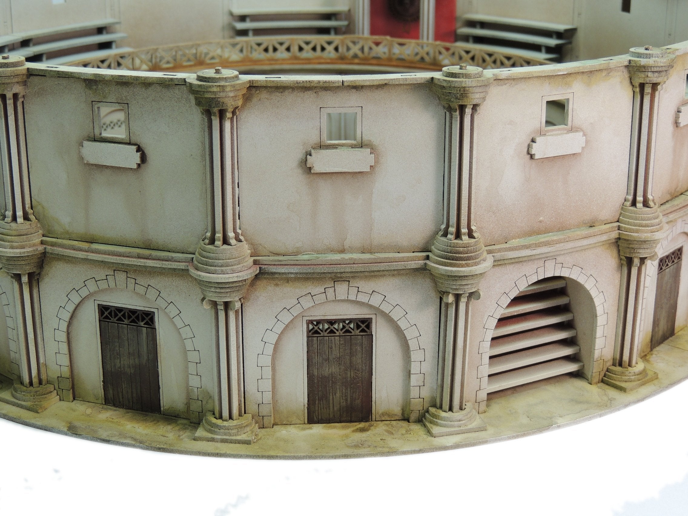 The terrain is made from MDF and is part of Sarissa Precisions Streets of Rome range. 450mm full circumference (external) Internal arena 300mm. 130mm high