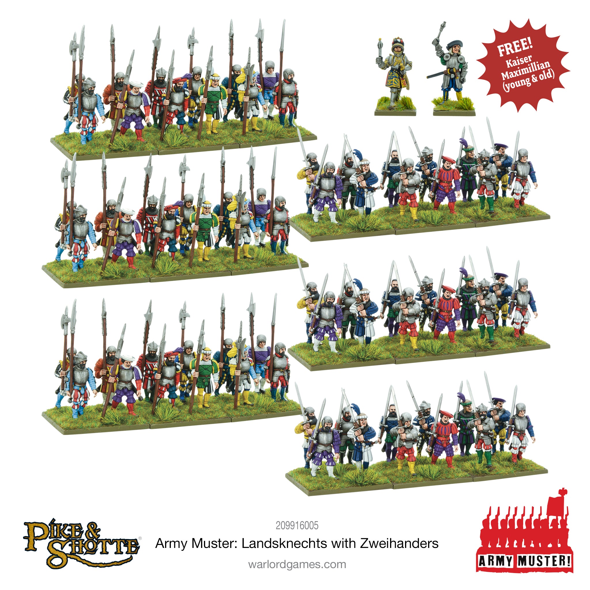 This Army Muster Bundle Contains enough miniatures to make 36 Landsknechts with ith two-handed swords and 36 with halberds. Additionally, this bundle contains the character Kaiser Maximilillian I for free, in both young and old guises Waging war against France and within Italy, Maximillian hired sleuths of Landsknechts and was keen to give the men freedom to wear what they wanted, resulting in plumes, slashed sleeves and bright colours.
