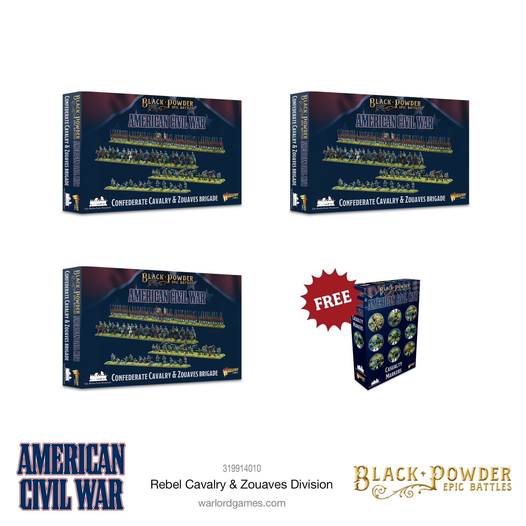 This bundle provides enough models to field a complete Confederate division comprising three zouaves regiments of 100 men each, three regiments of cavalry, three regiments of dismounted cavalry and three regiments of skirmishers. As an added bonus, you’ll get some Warlord ResinTM casualty markers completely free; vital to track proceedings on the Black Powder Epic Battles tabletop.