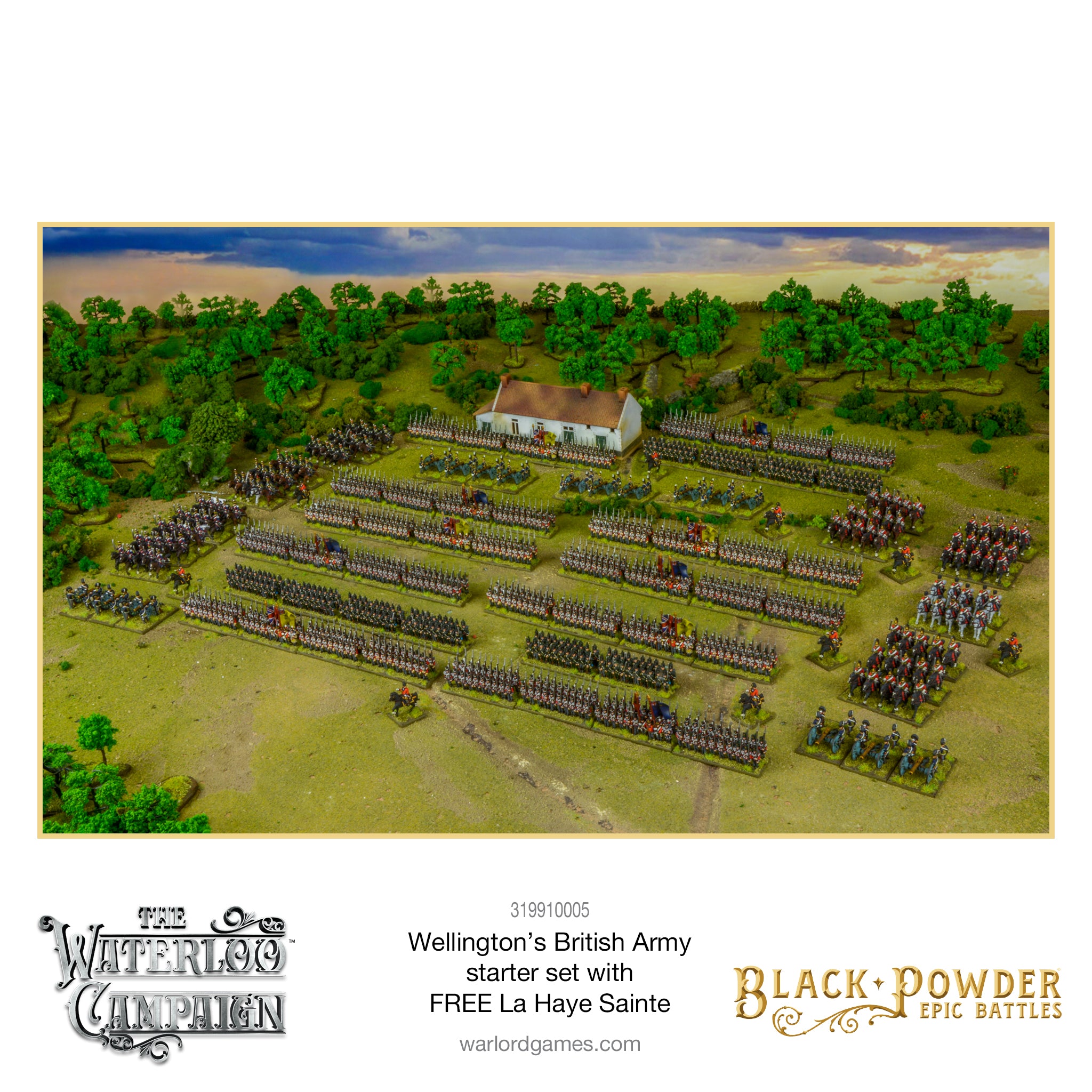 This bundle contains an Epic Battles: Waterloo British Starter Army and a FREE La Haye Sainte Farmhouse!