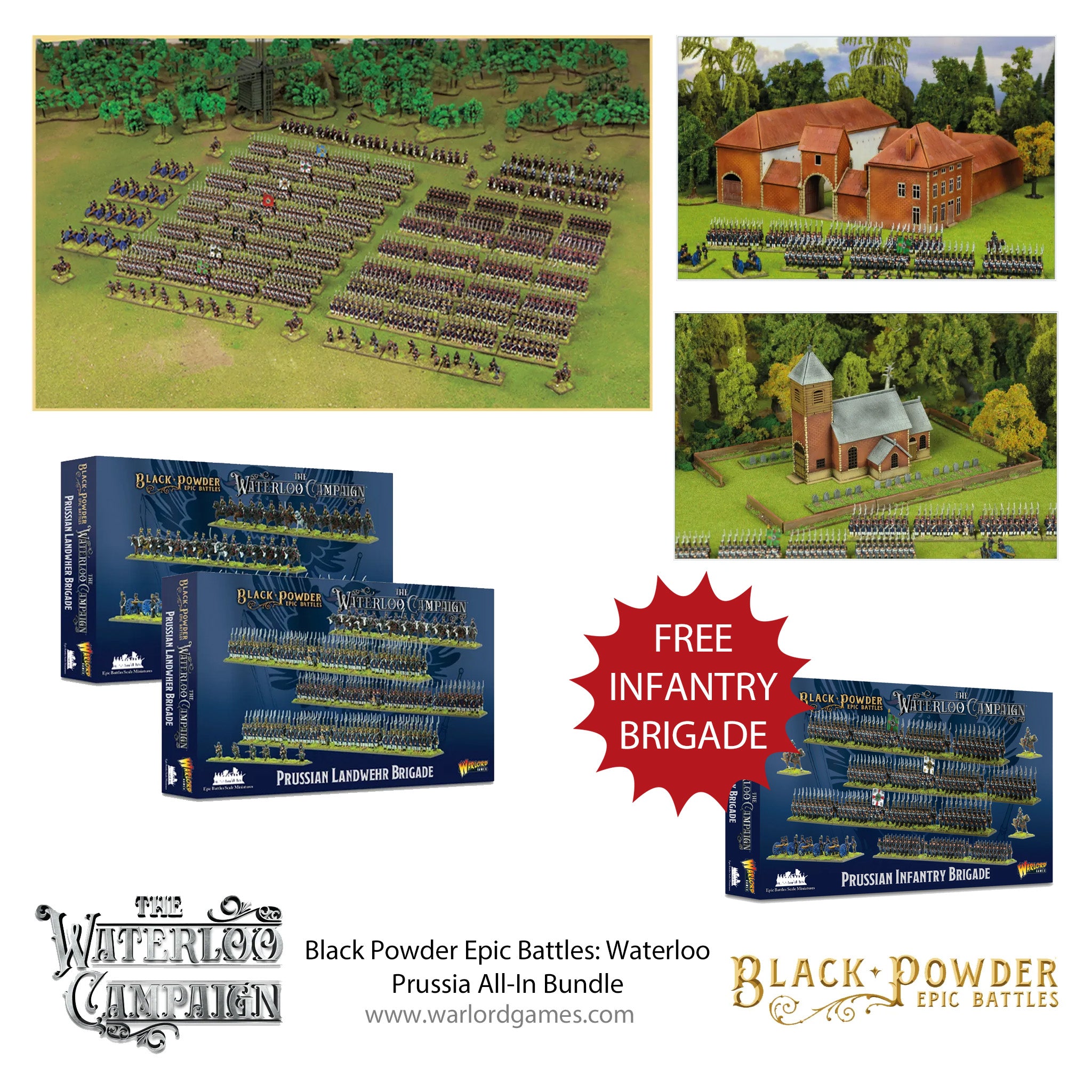 The long-awaited Prussian Army joins the Epic Battles fray in spectacular fashion. This bundle gives you the starter army, packed to the brim with over a thousand miniature soldiers, an additional brigade each of cavalry and Landwehr and both the epic new scenery sets focused around the actions at Placenoit and Papelotte. You'll also receive an additional infantry brigade completely free!