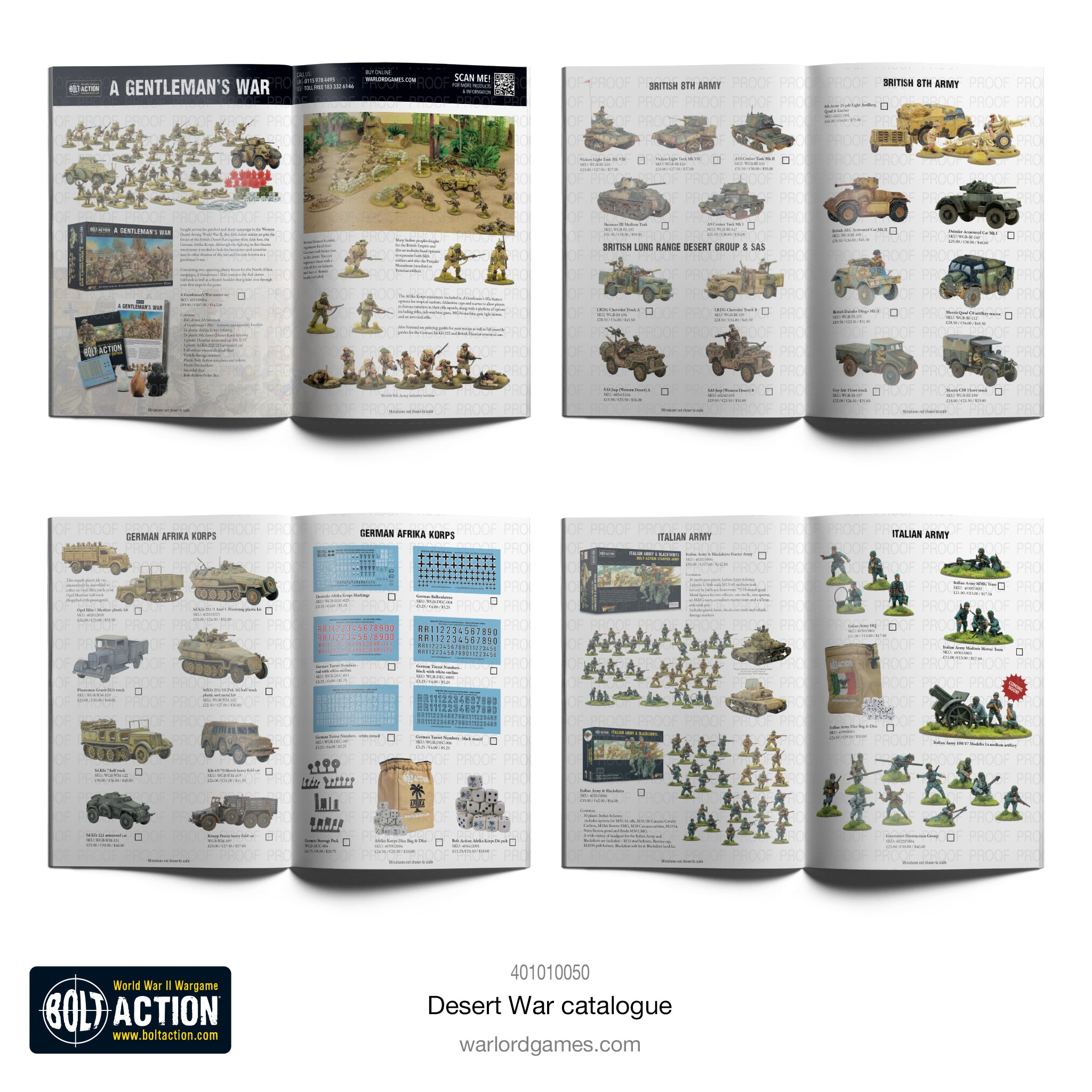 Showcasing stacks of figures, vehicles, decals, paints and accessories for the Afrika Korps, Desert Rats and Italian Army, this newly refreshed booklet is the ideal way to catalogue your collection, and to plan and build Bolt Action armies ready to fight in the Western Desert!