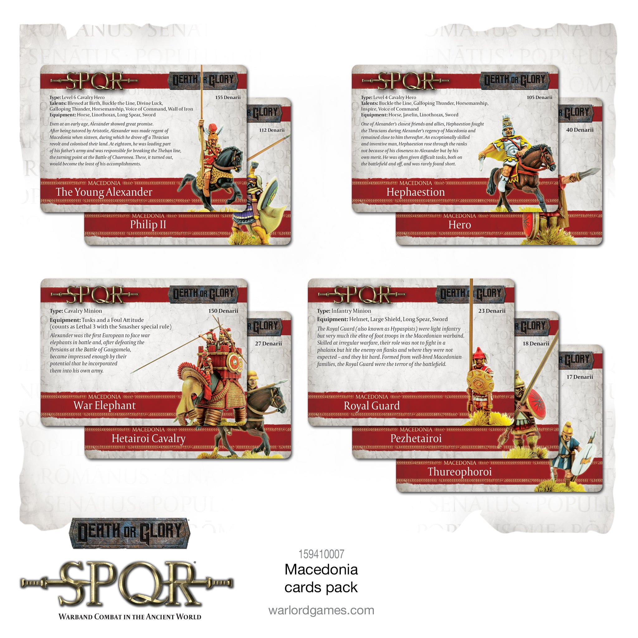Available for a limited time only, this card pack contains all the updated game cards for the Death or Glory SPQR Macedonia faction. The game cards are a convenient reference for rules and denarii values whilst playing.
