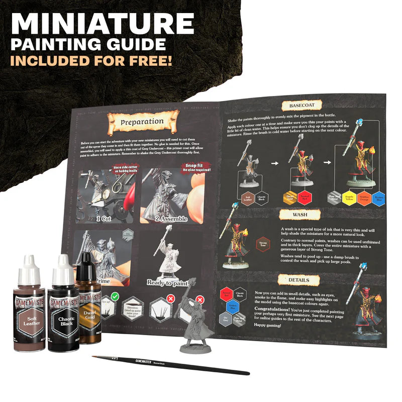 The GameMaster: Adventure Starter Role-Playing Paint Set includes 15 paints, consisting of 10 vibrant colours, 2 Effect paints, 2 Metallics, and 1 versatile Wash. You also get a Painting Guide, an Adventure Starter Guide, a GameMaster Starter Brush, and 5 snap-fit miniatures – FREE!