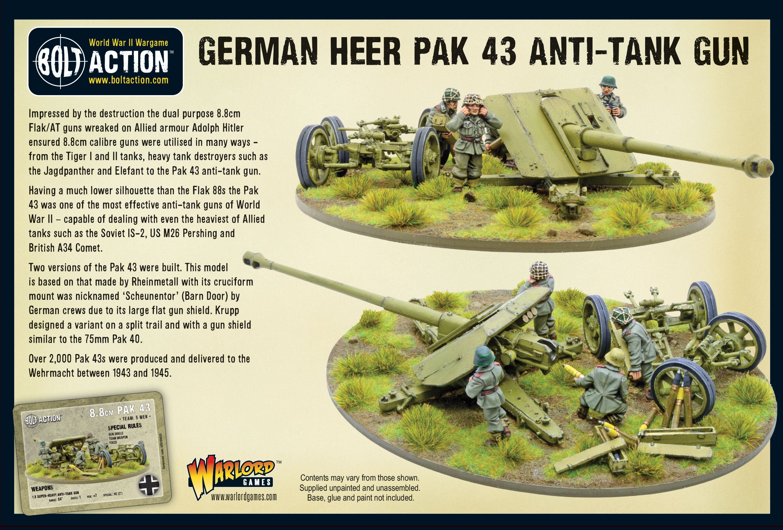 In games of Bolt action the Pak 43 can be included in Artillery Platoons and is a superheavy anti-tank gun, that can be towed by the Sd.Kfz 7 half-track.