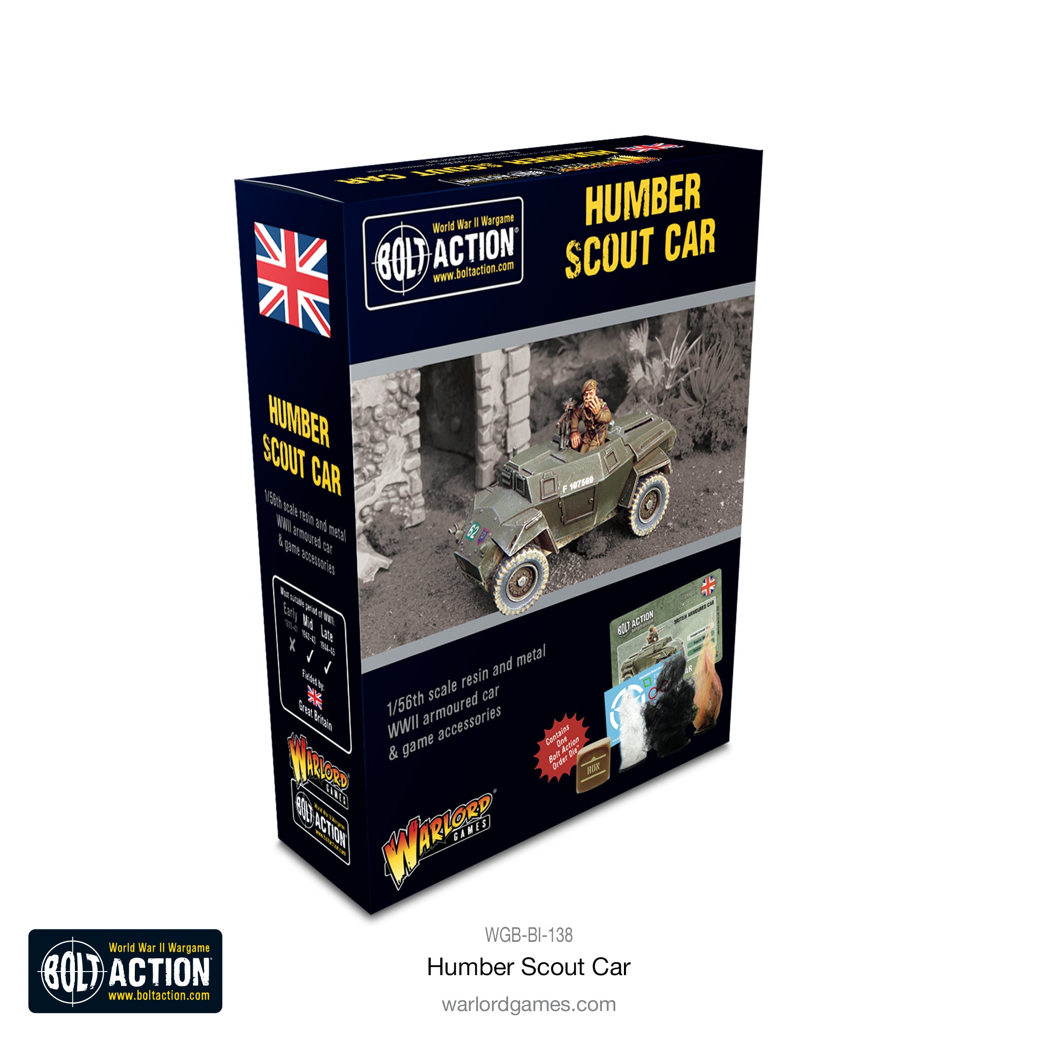 Contains one resin and metal armoured car, one Brigadier J.O.E. Vandaleur figure, Bolt Action stat card, vehicle damage markers, full colour waterslide decals, Bolt Action order die.