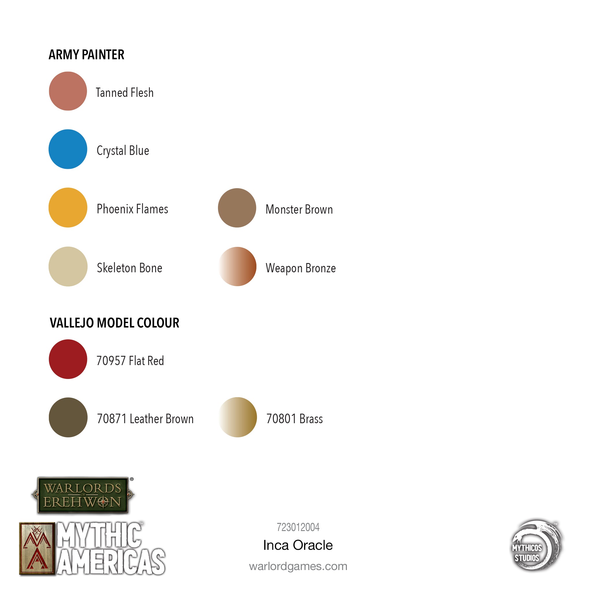 The Inca Oracle serves the people by interpreting the signs, omens, and portents of the gods. In battle, they support the Inca warband with their fell magic, augmenting their power by sacrificing virgins and drawing on their life energy.