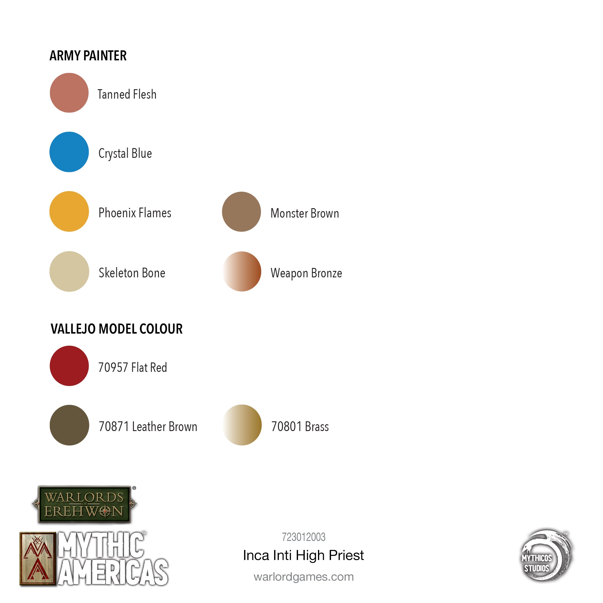 The elite spellcaster of the Inca warband, the Inti High Priest is a caster with MOD2 and Boundless, allowing him to cast two spells per turn. With the ability to sacrifice virgins for a better casting roll, the High Priest is very effective at supporting his allies.