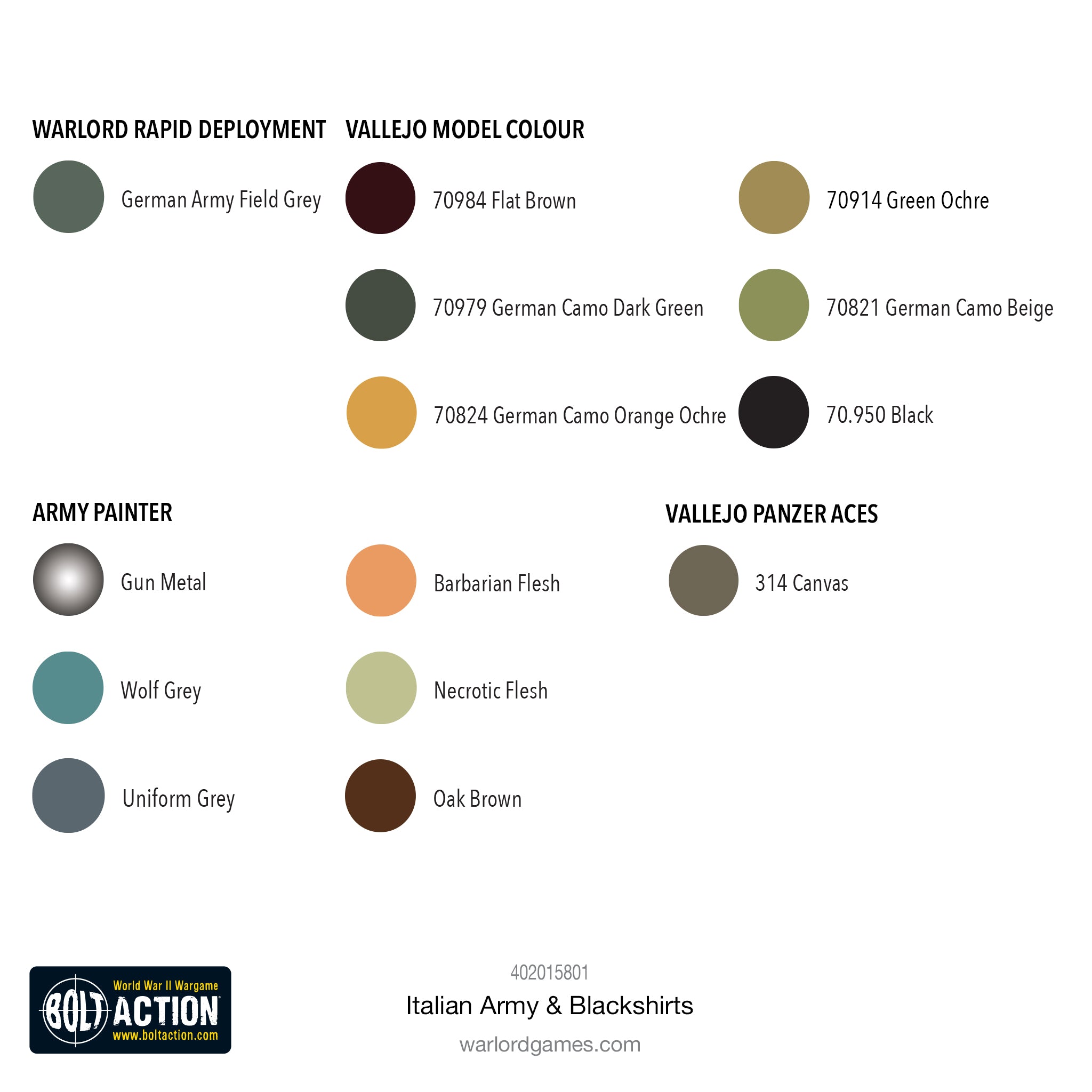 A wide variety of headgear for the Italian Army and Blackshirts are included – M33 steel helmets, Bustina cap, M1935 pith helmet, Blackshirt soft fez & Blackshirt hard fez.