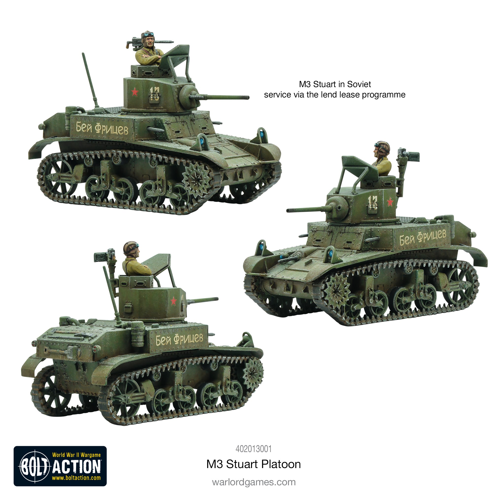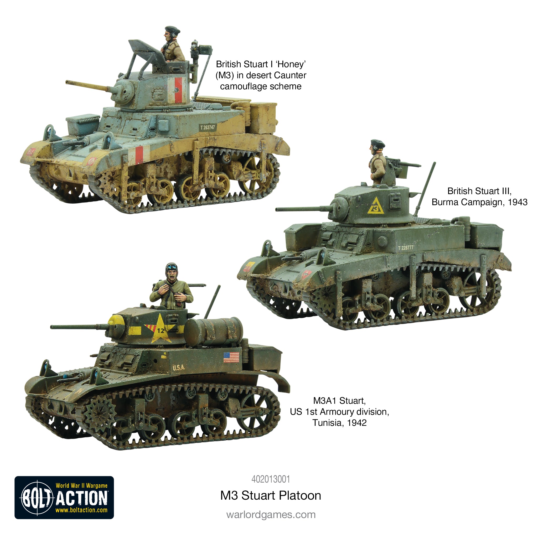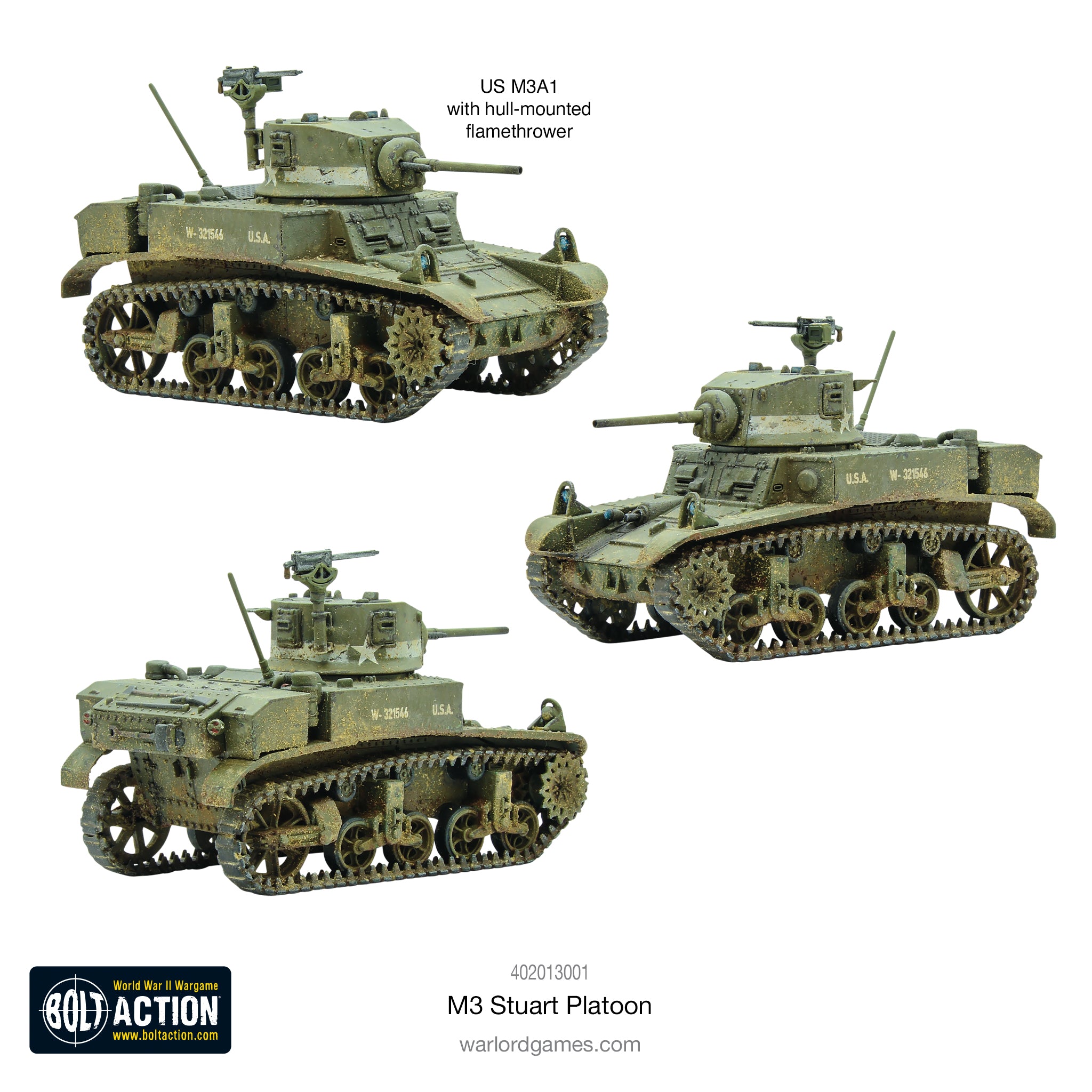 This platoon comprises x3 plastic M3 Light tanks with options to use: