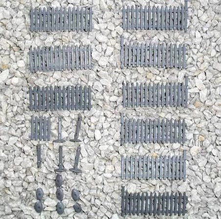 This is a 28mm Scale kit of a Picket fence designed by Tim Adcock and manufactured by Renedra. The fence pieces are approximately 6cms long and 2.2cms tall.