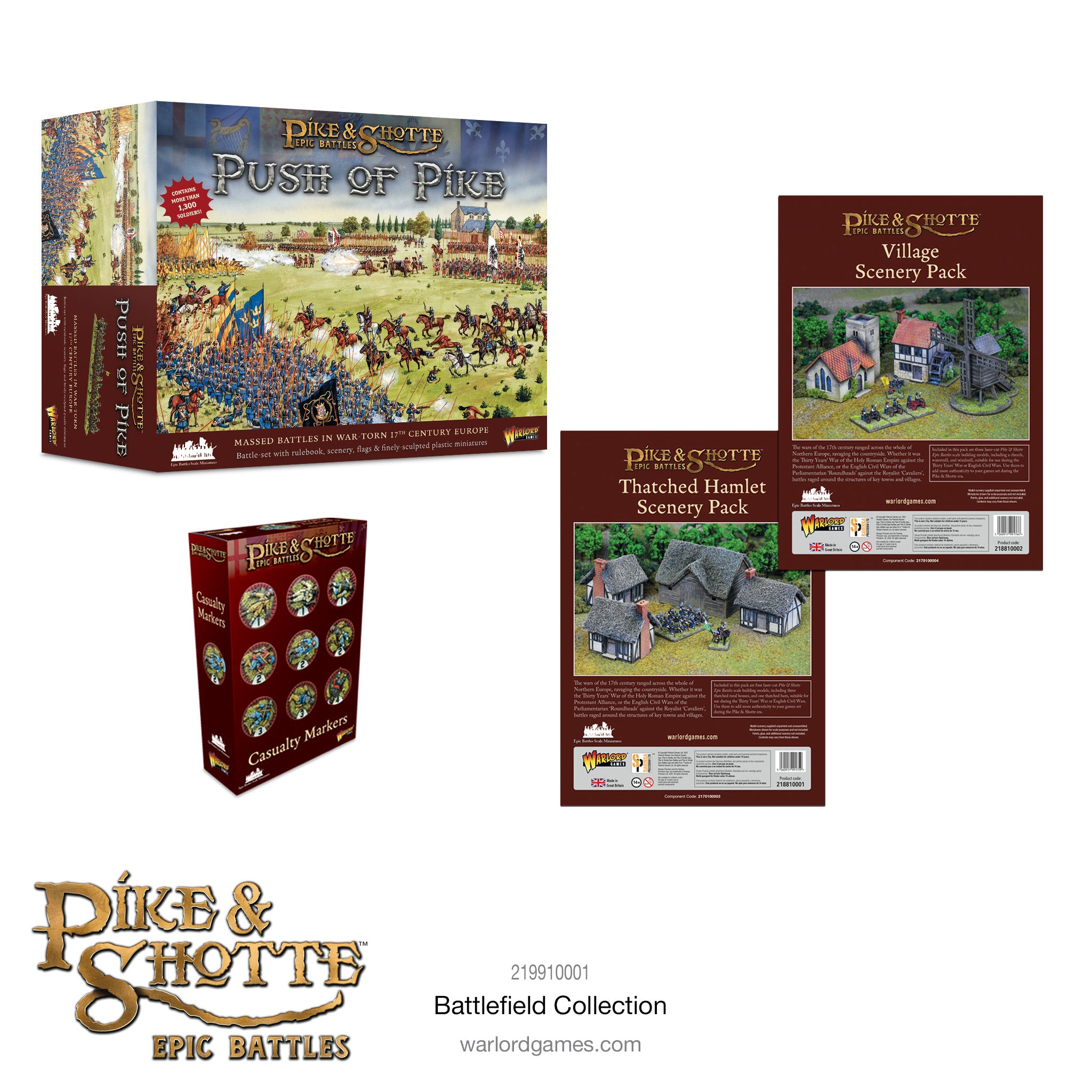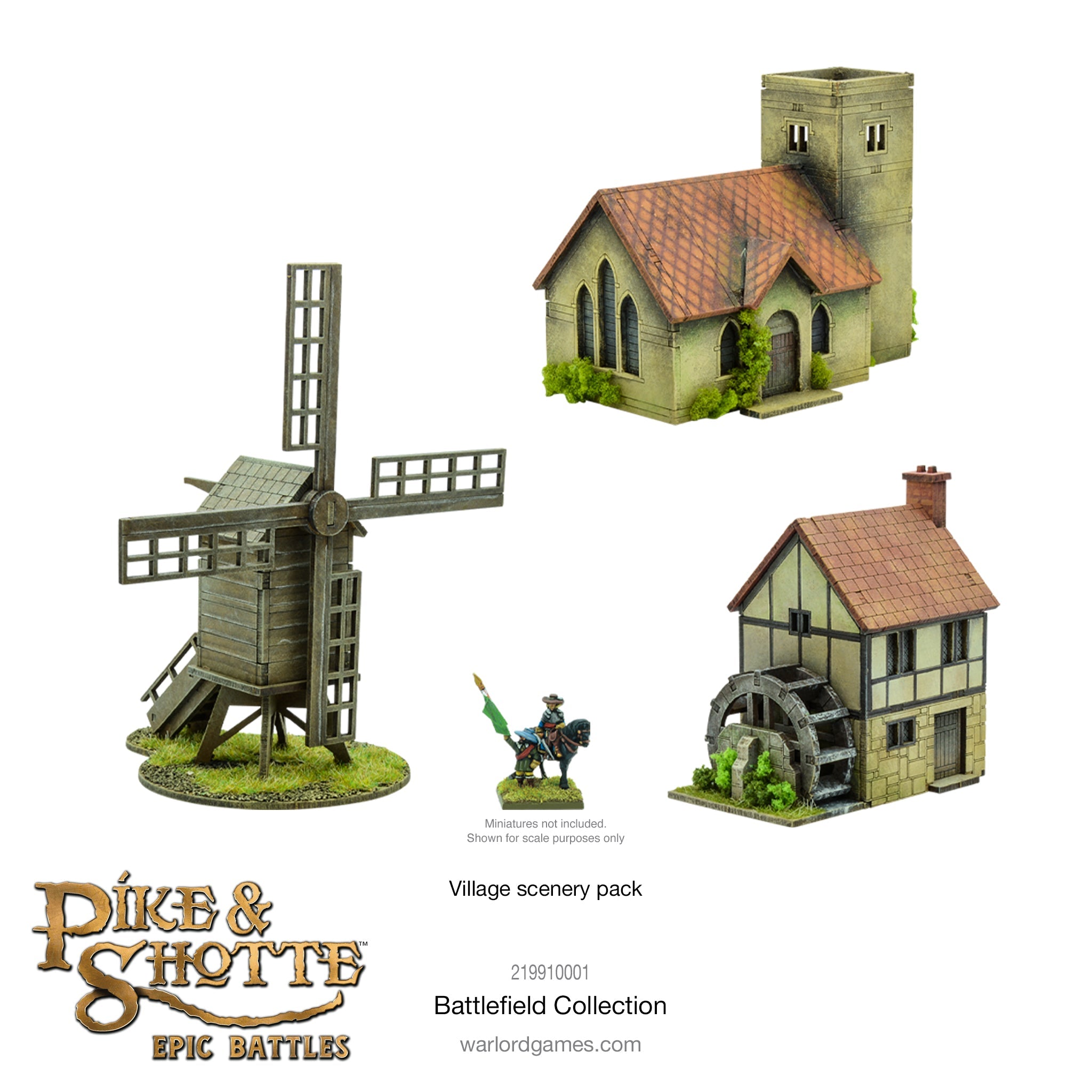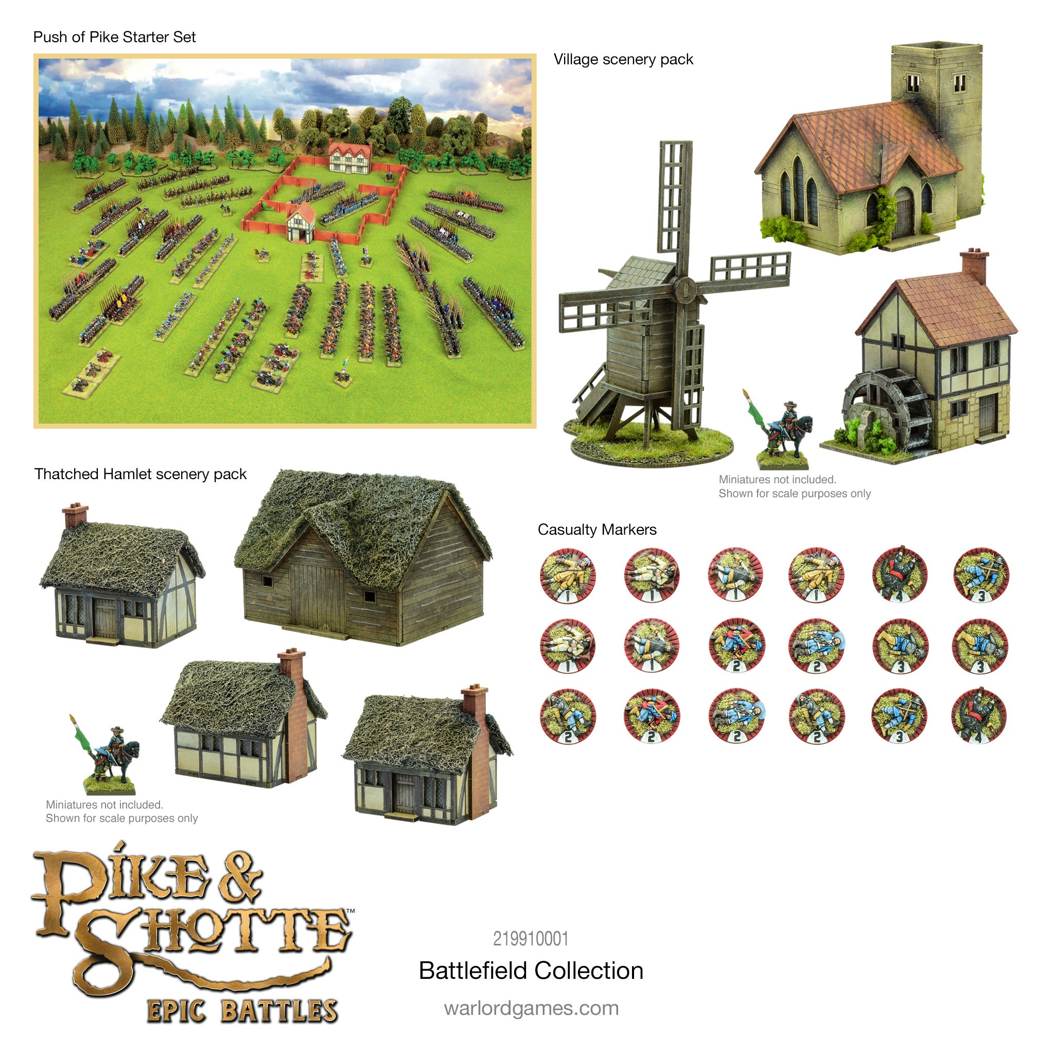 The Pike & Shotte Epic Battles Battlefield Collection is primarily concerned with providing the best-looking battlefield for the period. As well as the 1,300 figures and rulebook found in the starter set, you’ll receive several laser-cut MDF scenery kits – a fortified manor town house complex, three thatched rural house, a thatched barn, a church, a watermill and a windmill. Additionally, Warlord resinTM markers are included to conveniently track your units’ casualties with a visual flourish, plus…