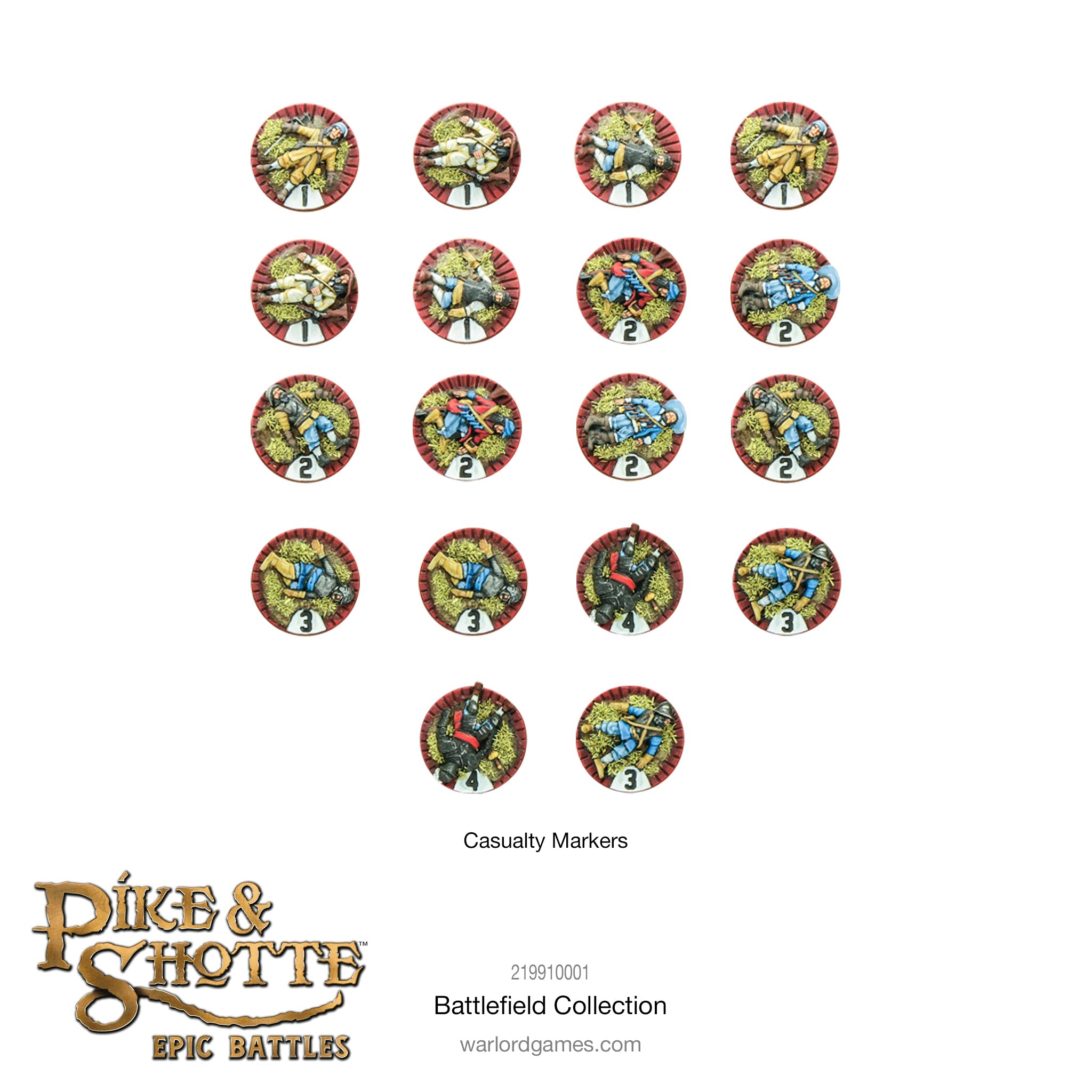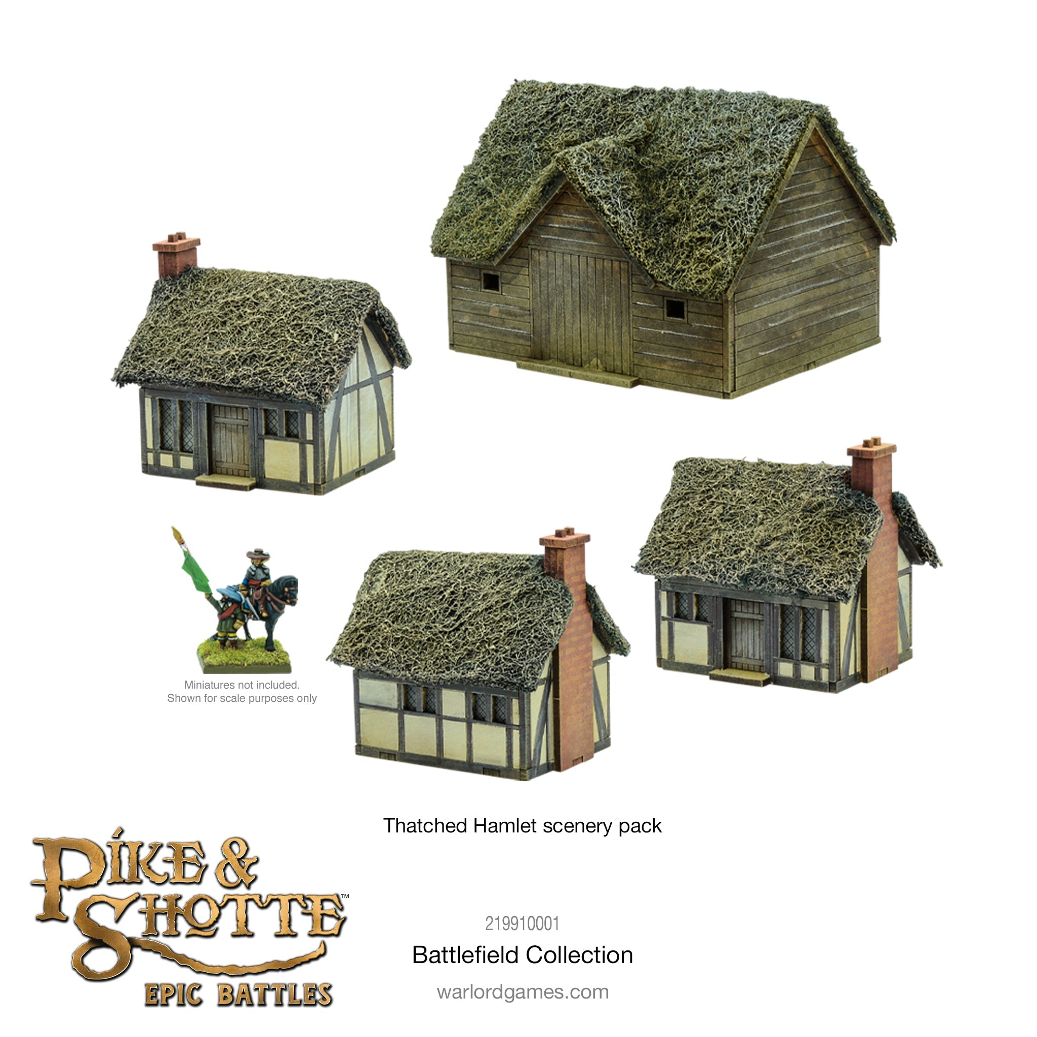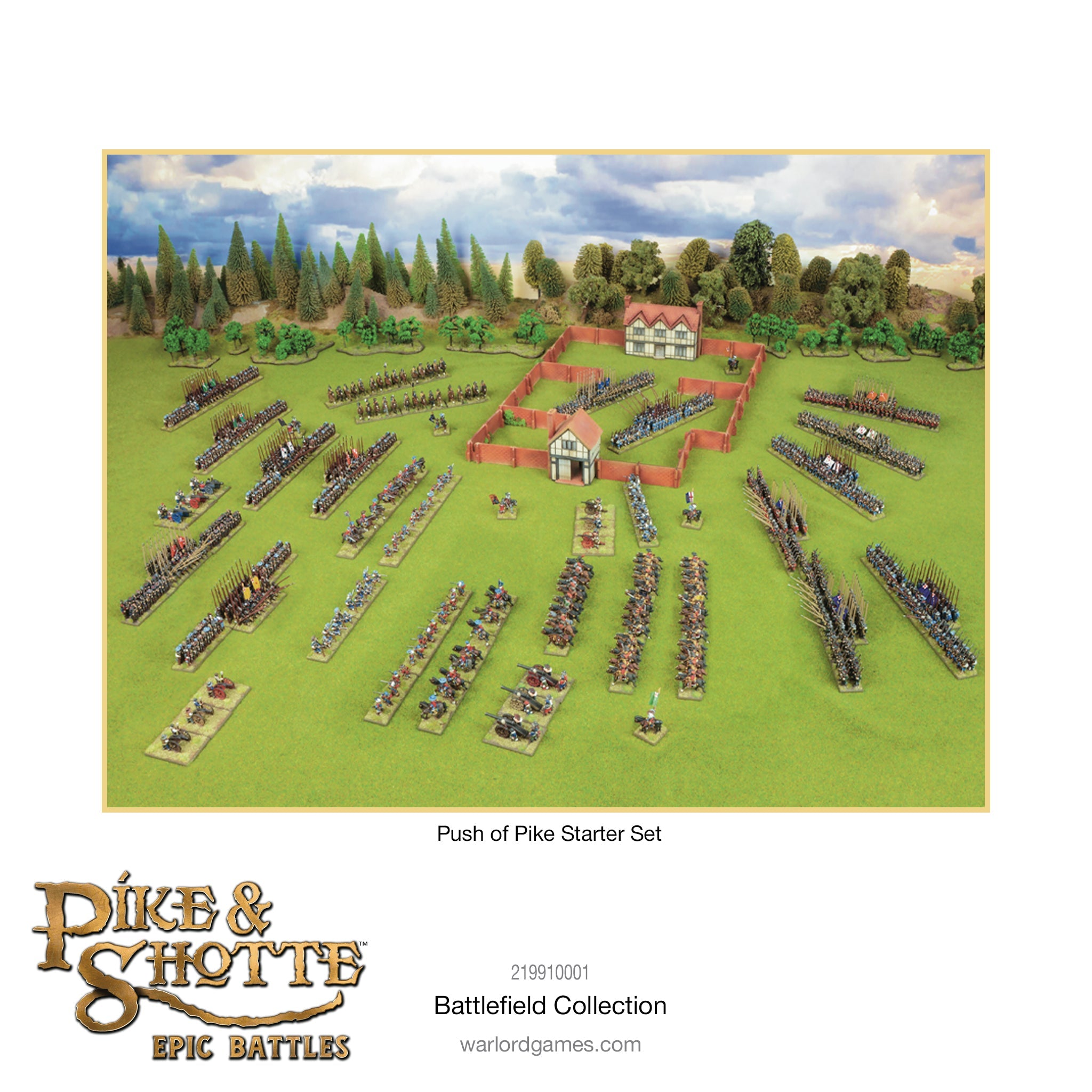 The Pike & Shotte Epic Battles Battlefield Collection is primarily concerned with providing the best-looking battlefield for the period. As well as the 1,300 figures and rulebook found in the starter set, you’ll receive several laser-cut MDF scenery kits – a fortified manor town house complex, three thatched rural house, a thatched barn, a church, a watermill and a windmill. Additionally, Warlord resinTM markers are included to conveniently track your units’ casualties with a visual flourish, plus…