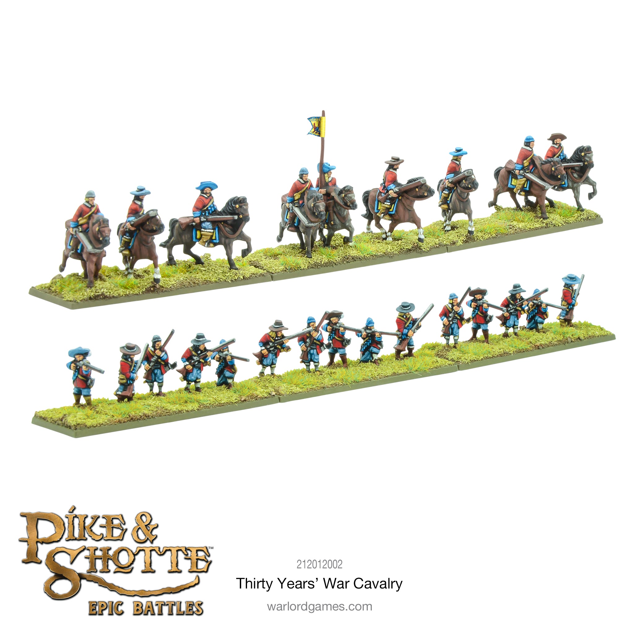This boxed set contains the following plastic figures: 30 harquebusiers, 6 cuirassiers, 3 cornets, 9 mounted dragoons, 15 dismounted dragoons, 18 commanded shotte, 3 Saker medium guns, 3 Falconet light guns, 3 mounted battalia commanders and 3 ensigns on foot, plastic bases, and a full-colour flag sheet with Thirty Years’ War colours.