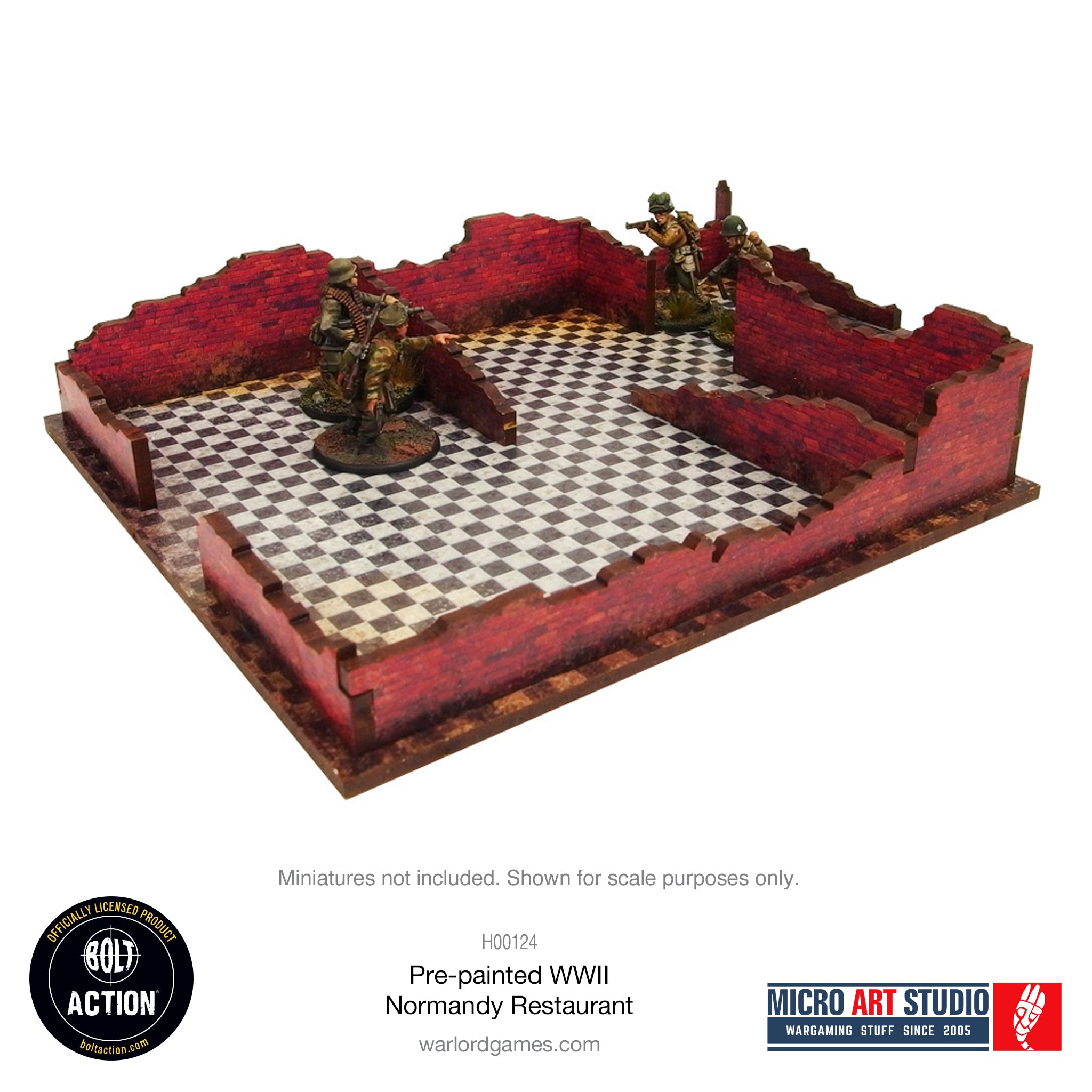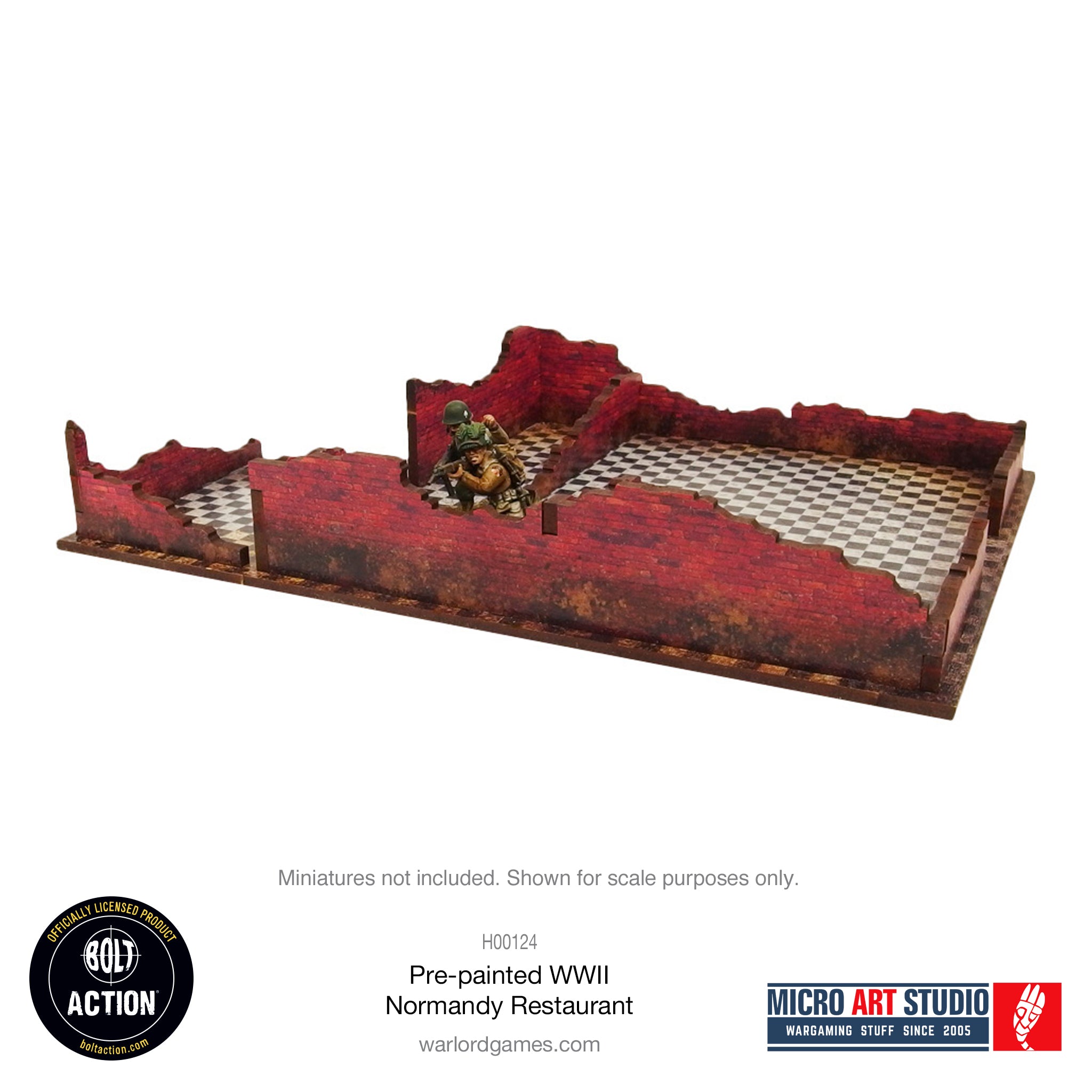 Multicolor prepainted (UV-printed) 3-level WW2 Normandy Restaurant building with accessible colorful interiors, removable levels and removable ruined ground floor. Room to fit in the whole infantry squad inside. Pre-cut acrylic transparent window panes included. Option to assemble with open or closed doors.