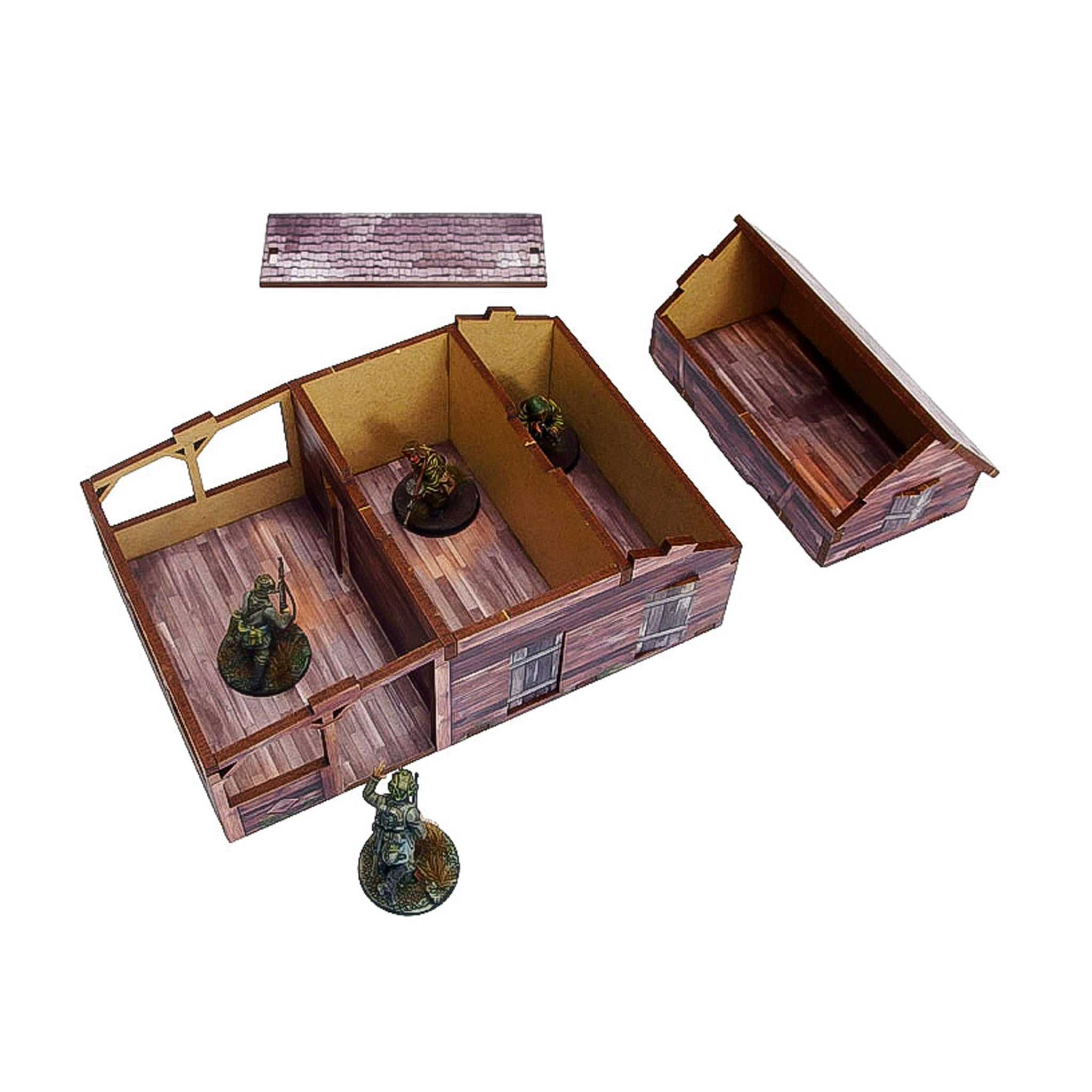 Multicolour pre-painted (UV-printed) WW2 Ostfront (East Front) Village Workshop - a farm building with accessible interiors and removable roofs. Large enough to fit a small infantry squad inside. Option to assemble with open or closed doors.