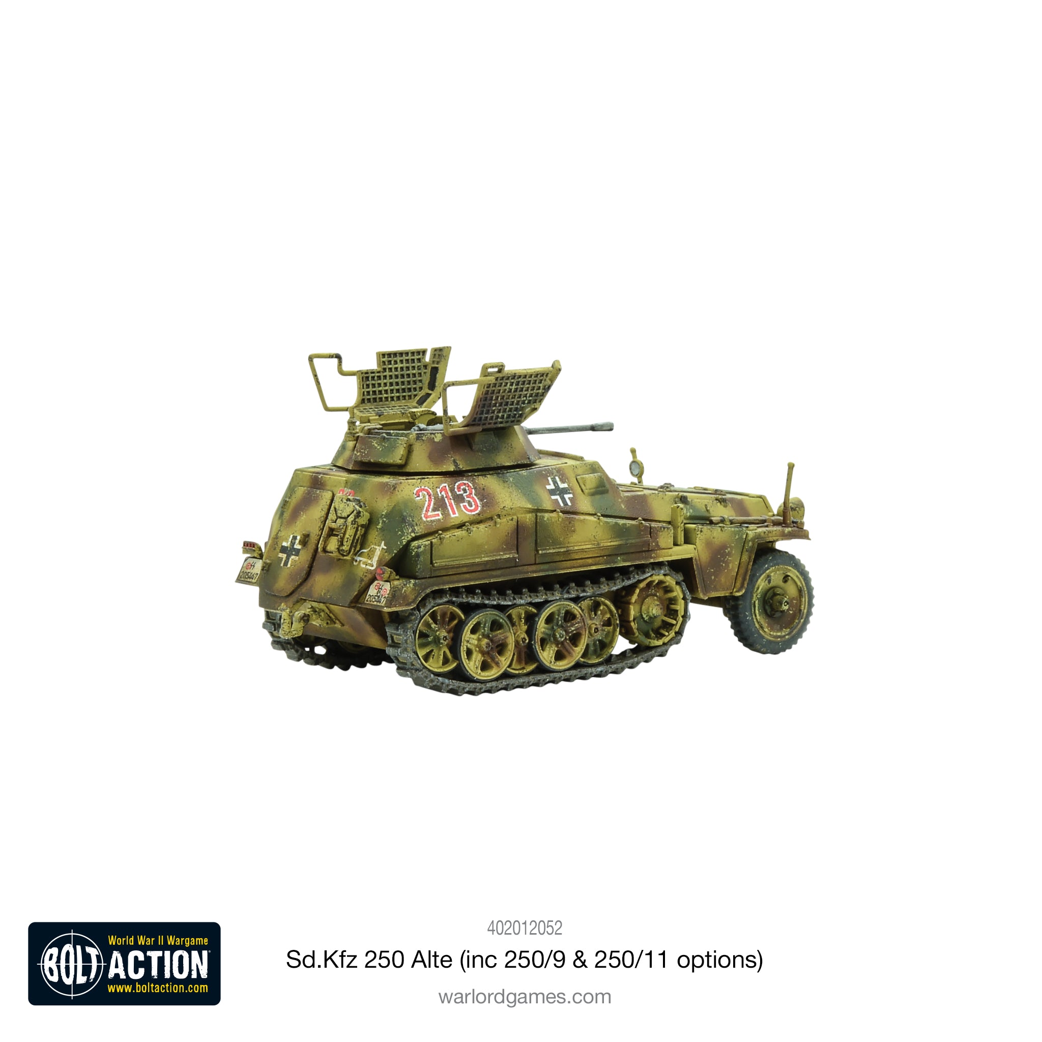 The Sd.Kfz 250/1 was a reconnaissance and transport half-track mainly used by scout and HQ units. The vehicle was a shortened version of the ubiquitous Sd.Kfz 251 Hanomag series and much like its longer cousin there were many variants fulfilling different roles, such as cable carriers, ammunition carriers and radio carriers, amongst others. It carried six men including the driver and the co-driver and was armed with two pintle-mounted MG34 machine guns, one shielded forward facing and the other covering the rear and air.