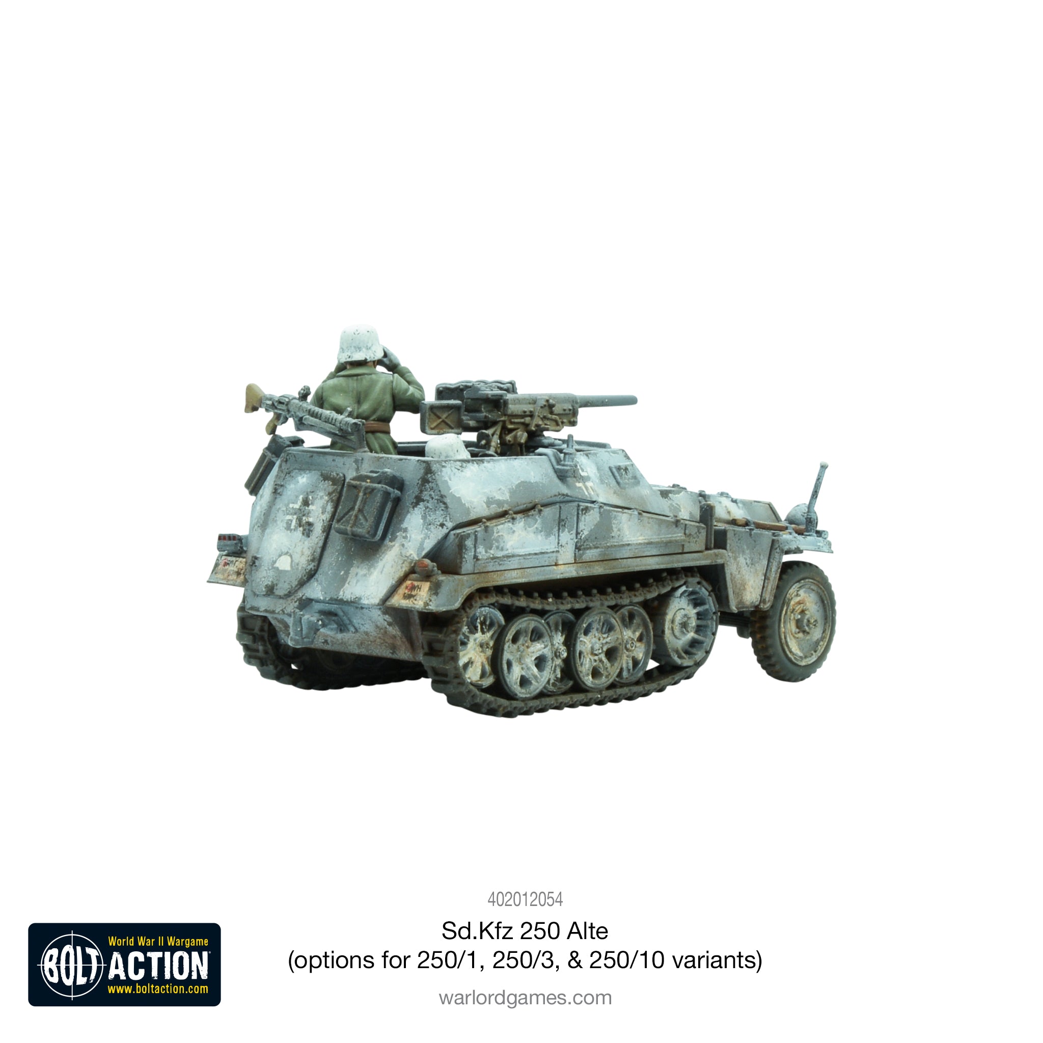 The Sd.Kfz 250/1 was a reconnaissance and transport half-track mainly used by scout and HQ units. The vehicle was a shortened version of the ubiquitous Sd.Kfz 251 Hanomag series and much like its longer cousin there were many variants fulfilling different roles, such as cable carriers, ammunition carriers and radio carriers, amongst others. It carried six men including the driver and the co-driver and was armed with two pintle-mounted MG34 machine guns, one shielded forward facing and the other covering the rear and air.
