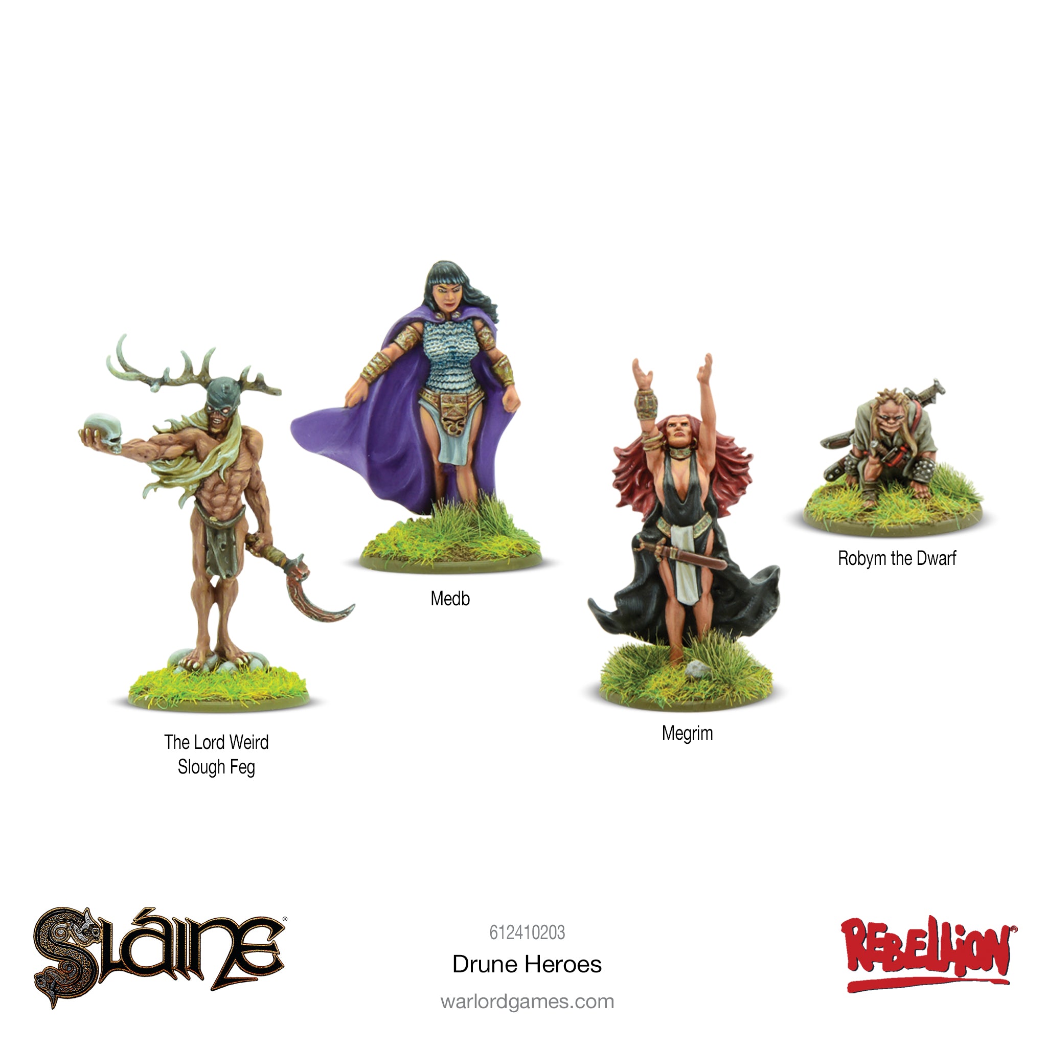 Supreme leader of the Drune Lords, the Lord Weird Slough Feg, a now insane twenty-thousand year old former Horned God laid waste to swathes of Tir Nan Og in the name of his foul master Crom Cruach. Leading his armies of Skull Swords and his wicked priestesses against the tribes of the Earth Goddess, Danu. One such priestess was Medb, a young girl taken from her village as sacrifice but showed great promise to Slough Feg, becoming a Druness instead of perishing in a wicker man conflagration.
