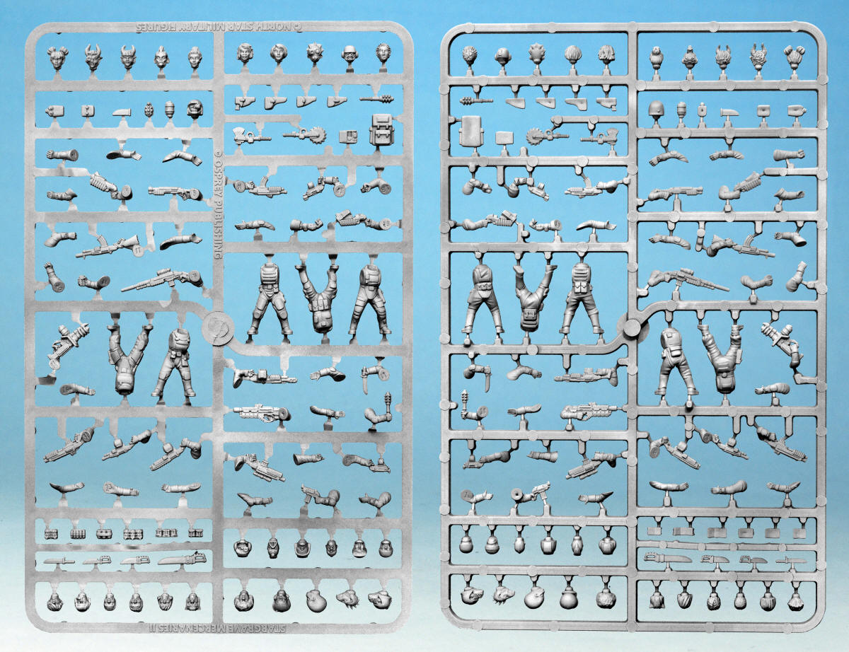 This boxed set offers enough parts to build 20 well-equipped female characters for Stargrave, ideal for use in independent crews or as members of the pirate fleets hunting them down. While this kit includes a range of weaponry and a mix of alien and human heads, even more variety can be achieved by mixing in components from other female Stargrave boxed sets.