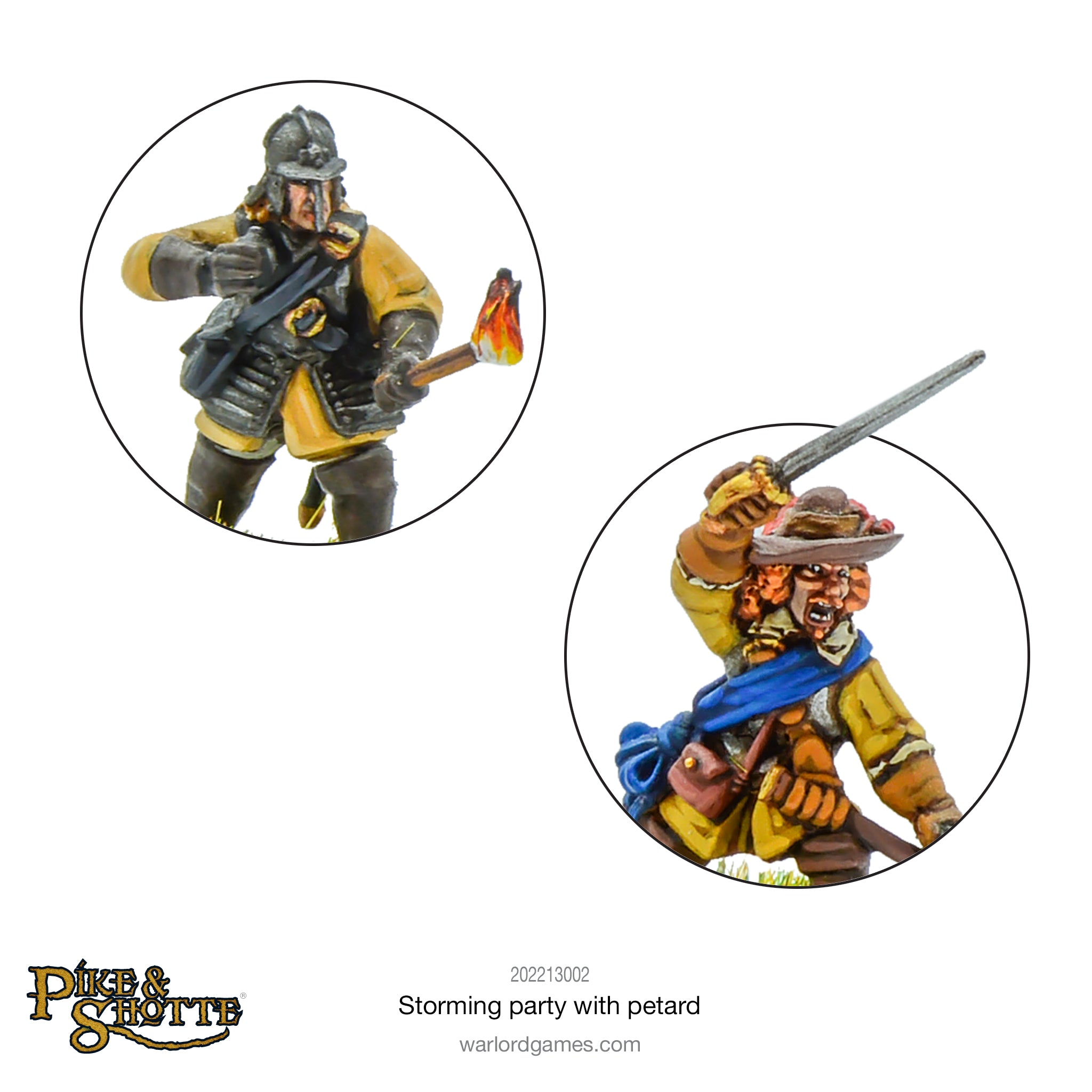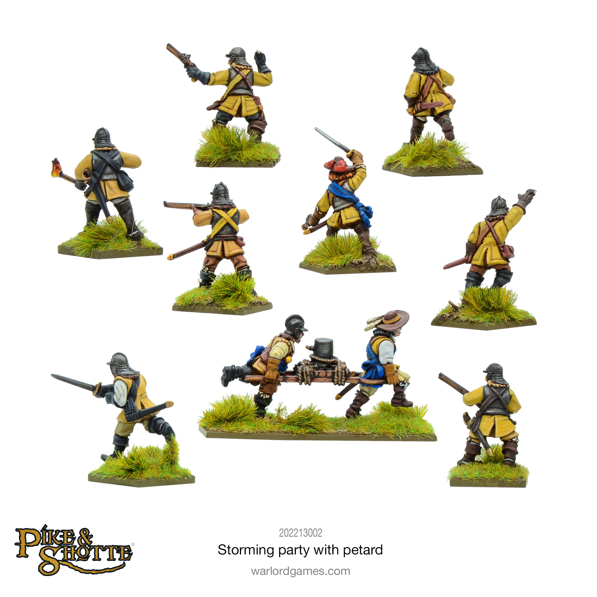 This petard team is accompanied by a troop of dismounted cavalrymen. Clad in stiff buff coats, back and breast armour and helmet, the troopers run forward – as fast as their high cavalry boots will allow. They are well-equipped to take enemy fire, but they are able to dish it out too, most carrying a brace of pistols and a stout sword. The corporals have their carbines to keep the enemy’s heads down, and some have been issued by the Firemaster with grenades – simple hand-hurled bombs that may be as dangerous to the thrower as the enemy!