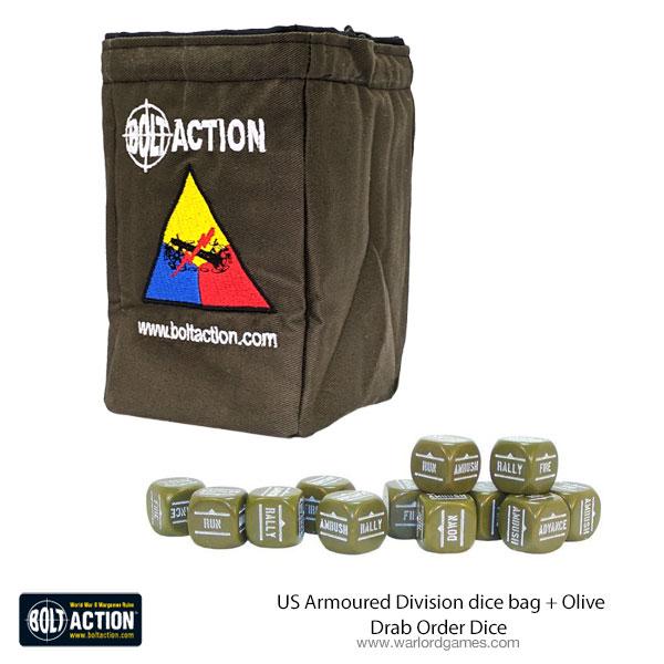 You get the US Armoured Division Dice Bag and one pack of 12 Olive Drab order dice.