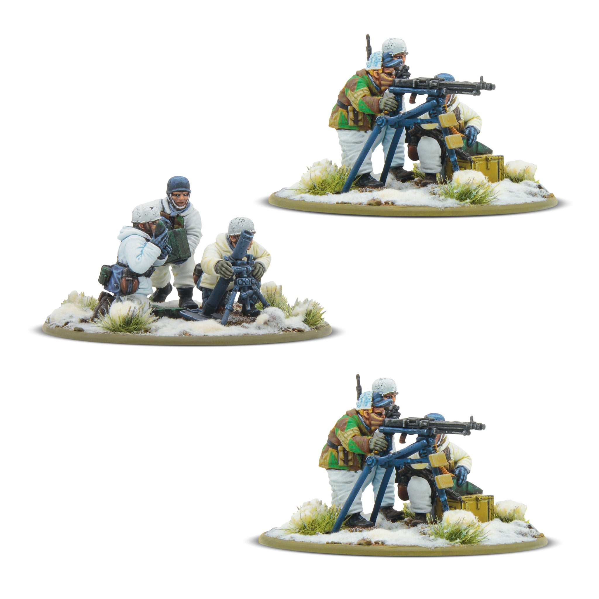 Box contains one Warlord Resin Fallschirmjäger (winter) officer, two metal medium machine guns with three Warlord Resin Fallschirmjäger (winter) crew each and one metal medium mortar with three Warlord Resin Fallschirmjäger (winter) crew. Also contains four Bolt Action Order dice, and plastic bases.